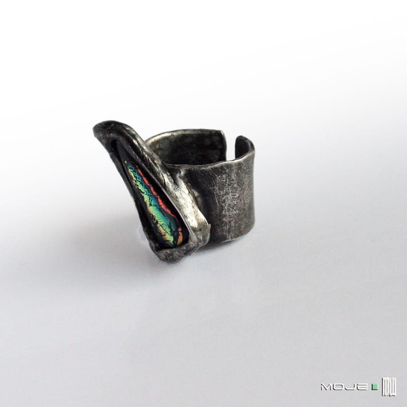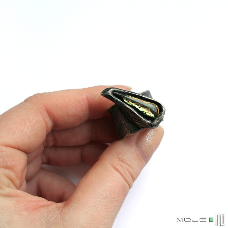 Szeroka obrączka ozdobiona trójkątnym szklanym okiem, które wytopiłam metodą fusingu ze szkła dichroicznego.