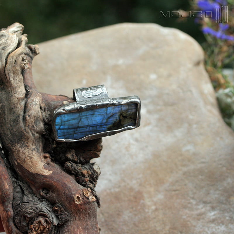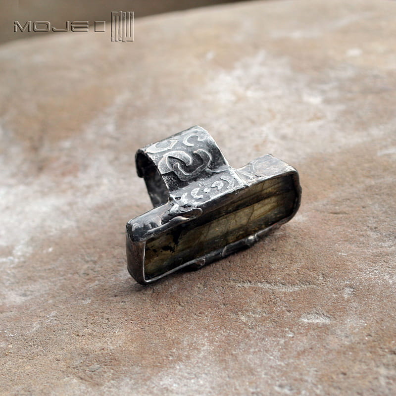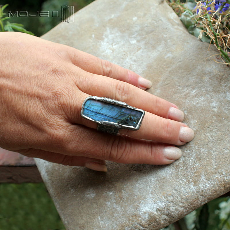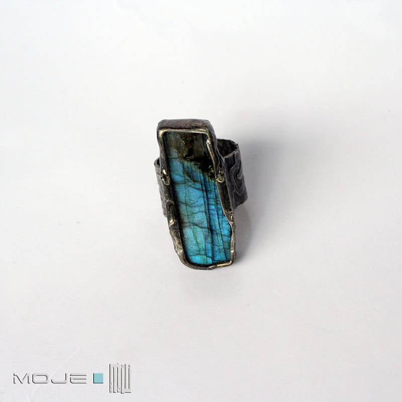 Pierścionek z labradorytem w kształcie niedokładnego prostokąta.