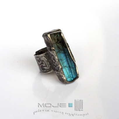 Pierścionek z labradorytem, częściowo polerowanym, w magicznym błękitnoszarozielonym kolorze. Kamień oprawiłam w miedź - cynowaną, patynowaną i przecieraną. Na szerokiej obrączce wytrawione są wzory nadające jej lekkości.
