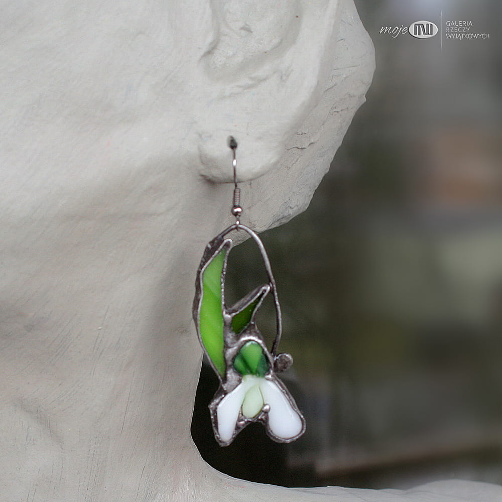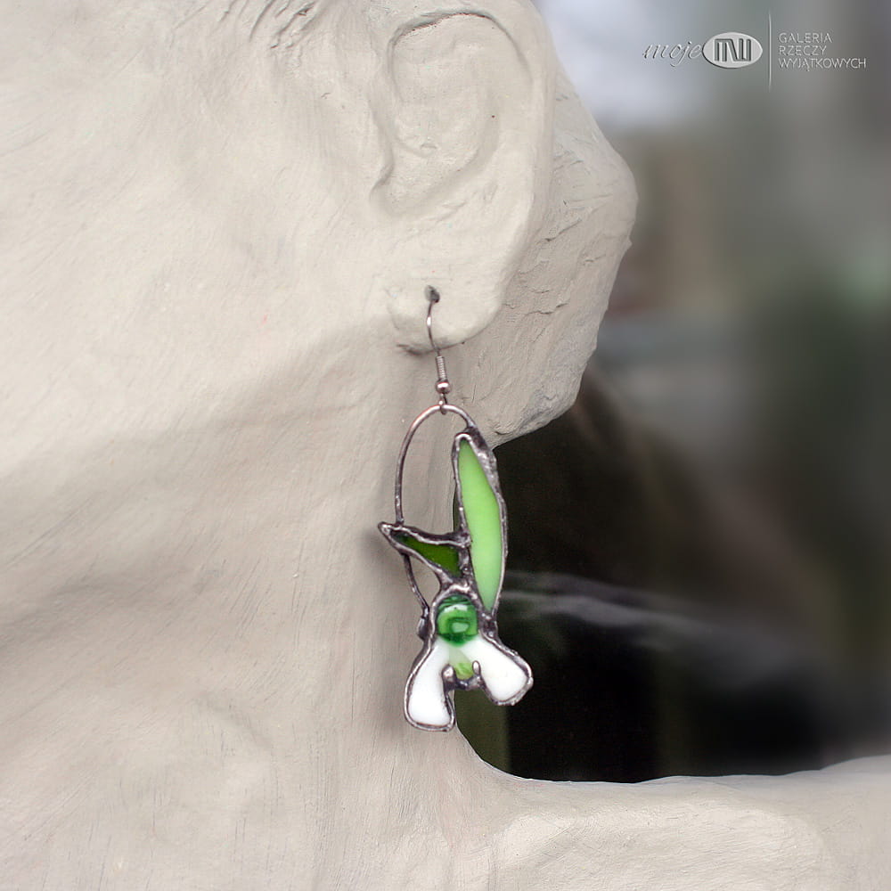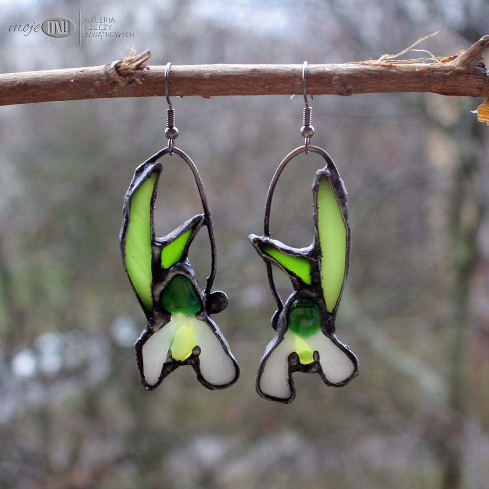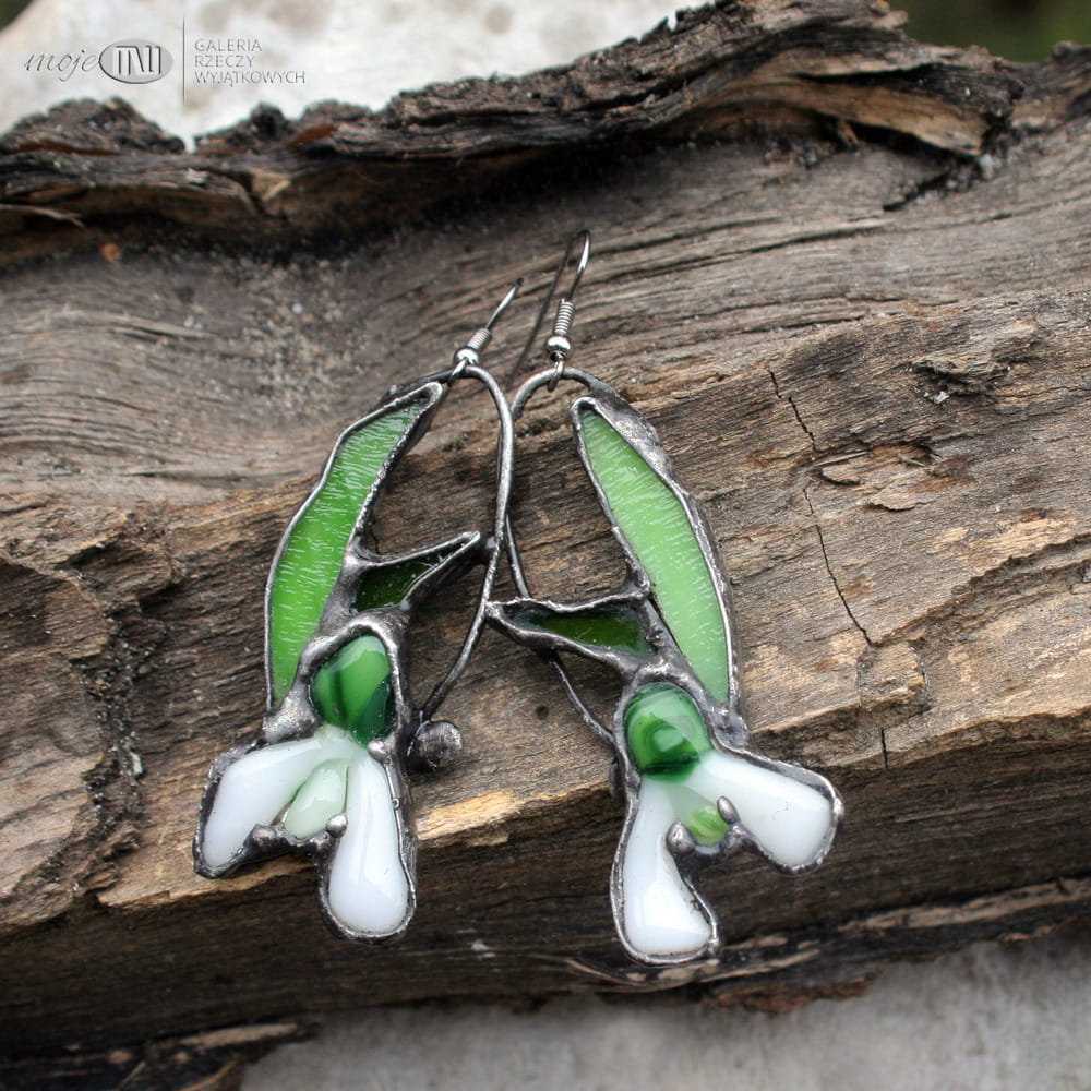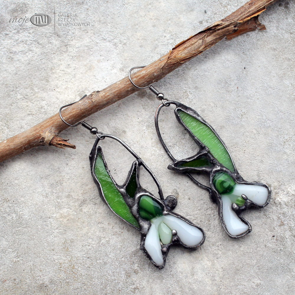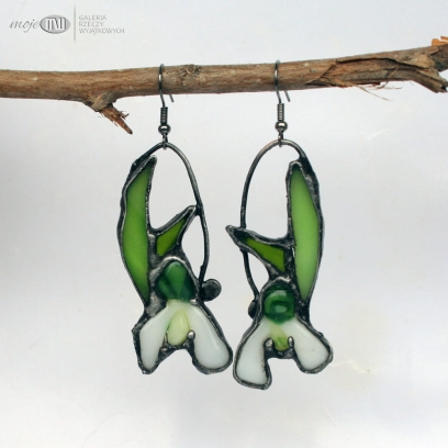 Z białego i zielonego szkła metodą fusingu wytopiłam kwiaty przebiśniegów. Dostały szklany listek i oprawę w miedź pokrytą cyną, patynowaną i przecieraną.