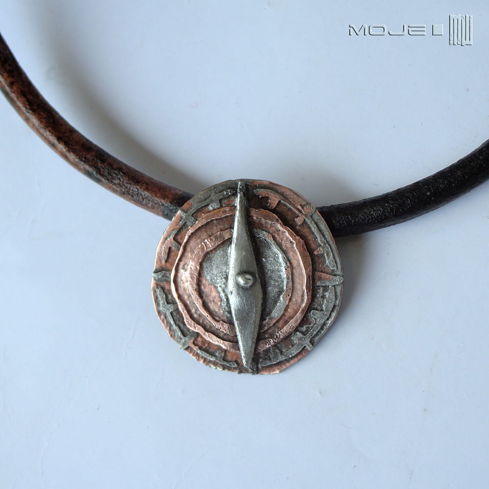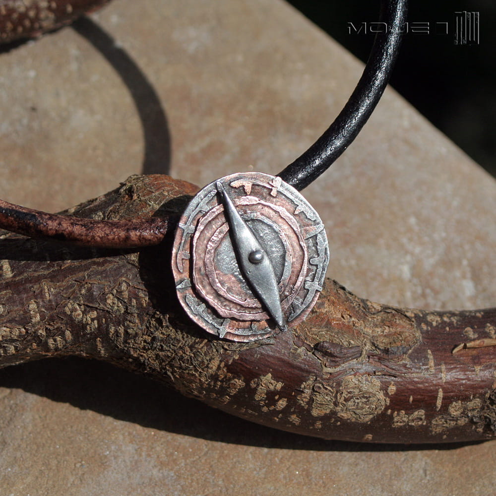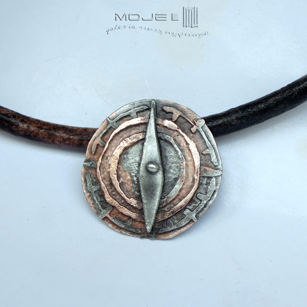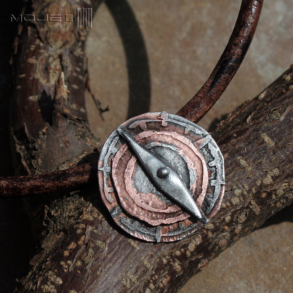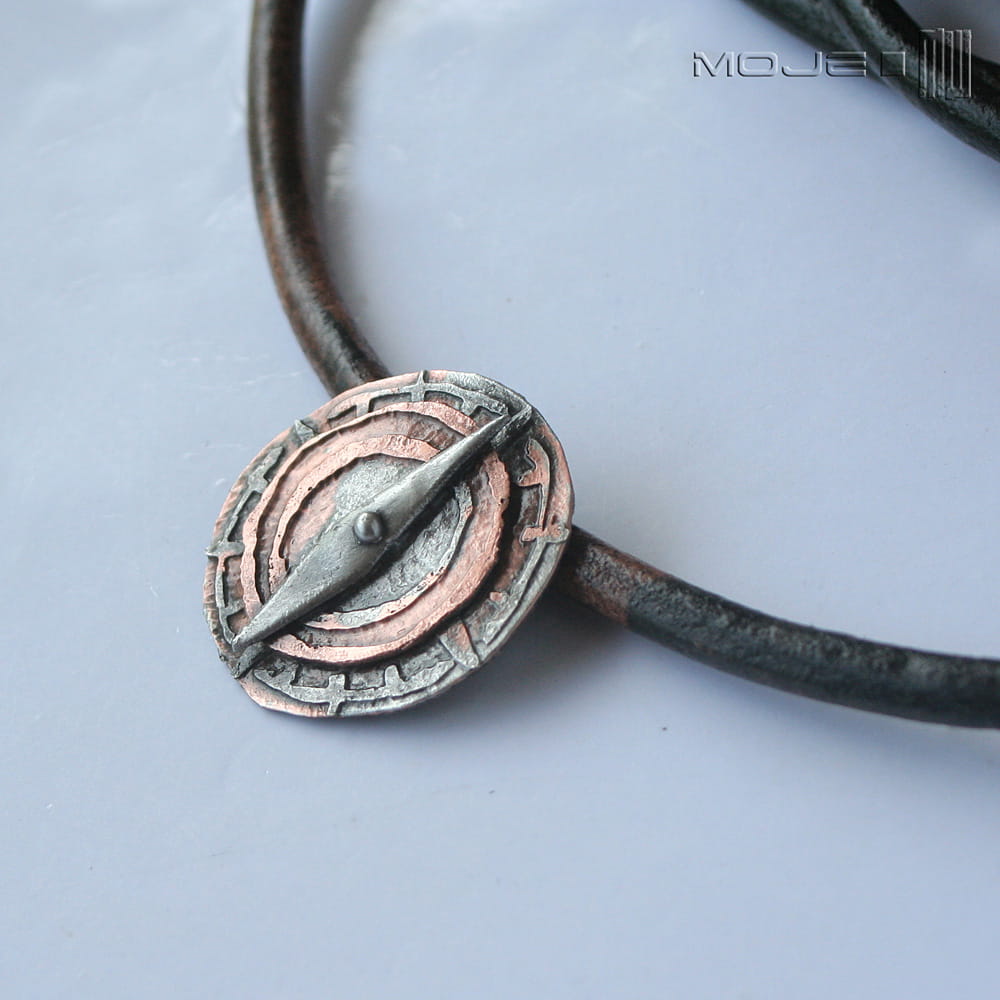 Wygląda jak stary artefakt znaleziony gdzieś w piasku na morskim brzegu... Zrobiłam go z trawionej miedzi, którą pokryłam cyną, spatynowałam nadając wiekowy wygląd i przetarłam dla wydobycia szczegółów. Wisior zawieszony jest na skórzanym rzemieniu w kolorze czarno-brązowym 5 mm o dł. ok. 50 cm