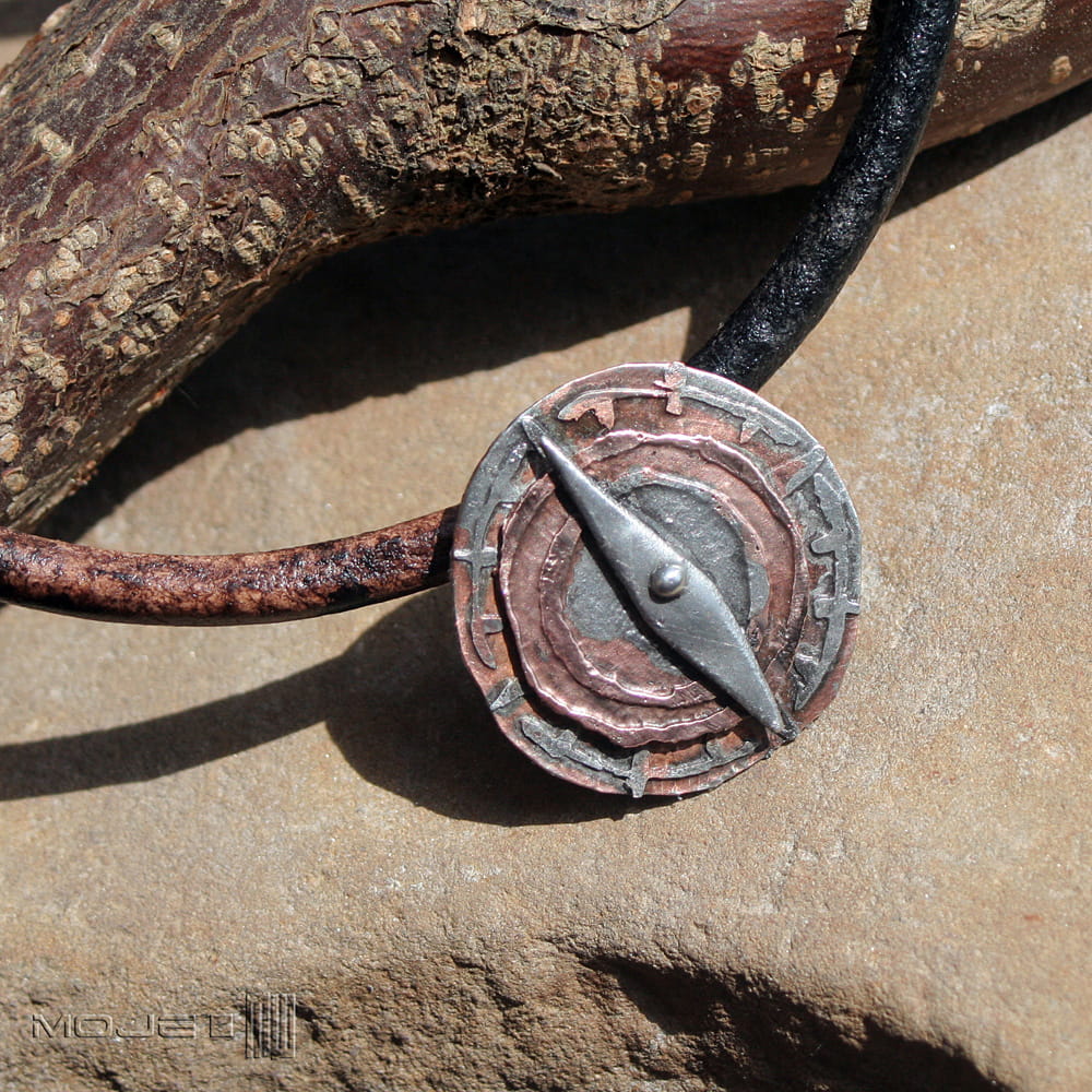 Miedziany wisior w kształcie róży wiatrów.