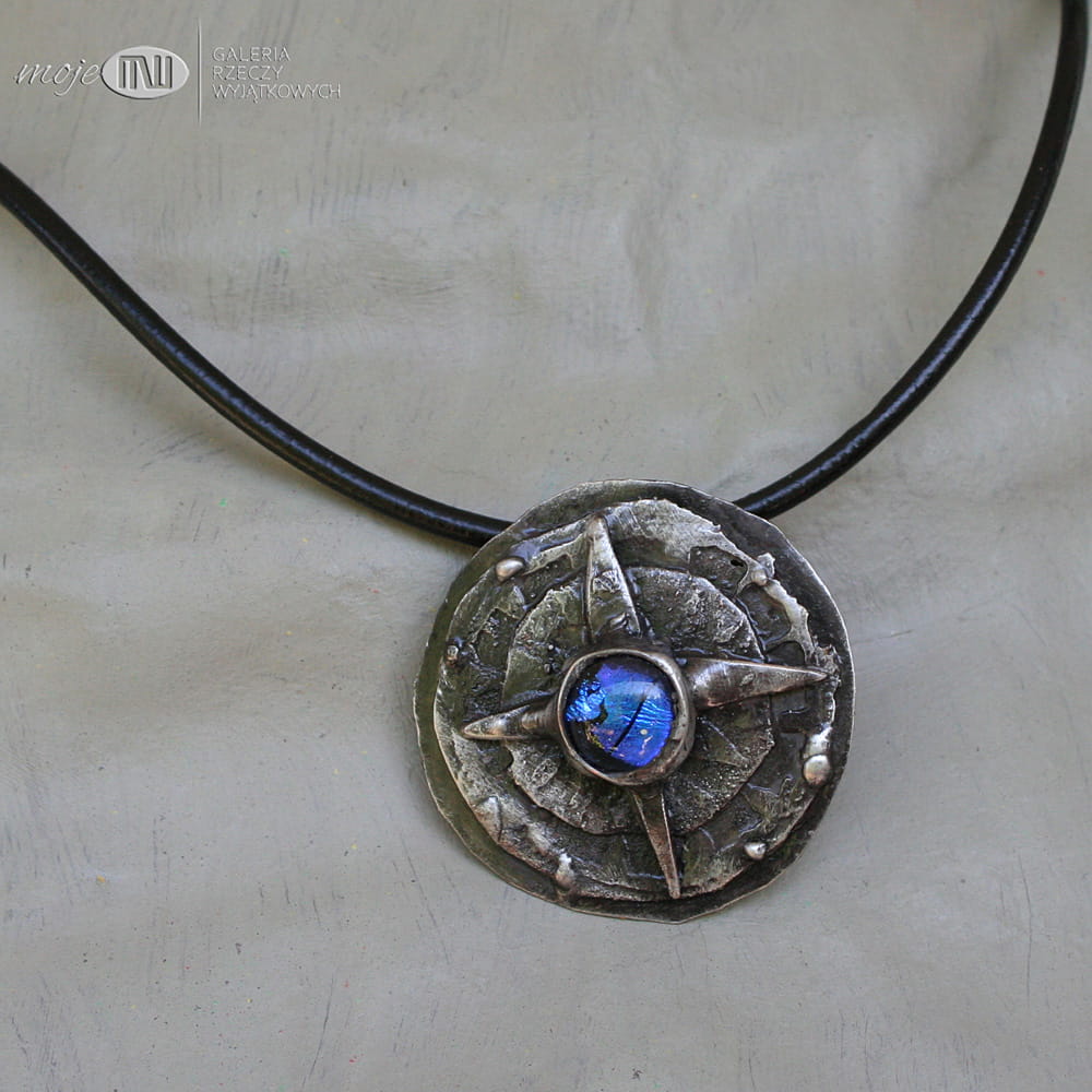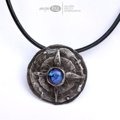 Wygląda jak stary artefakt znaleziony gdzieś w piasku na morskim brzegu... Zrobiłam go z trawionej miedzi, którą pokryłam cyną, spatynowałam nadając wiekowy wygląd i przetarłam dla wydobycia szczegółów. W centralnym punkcie jest szklany kaboszon, który wytopiłam metodą fusingu. Wisior zawieszony jest na czarnym skórzanym rzemieniu 3 mm o długości ok. 50 cm