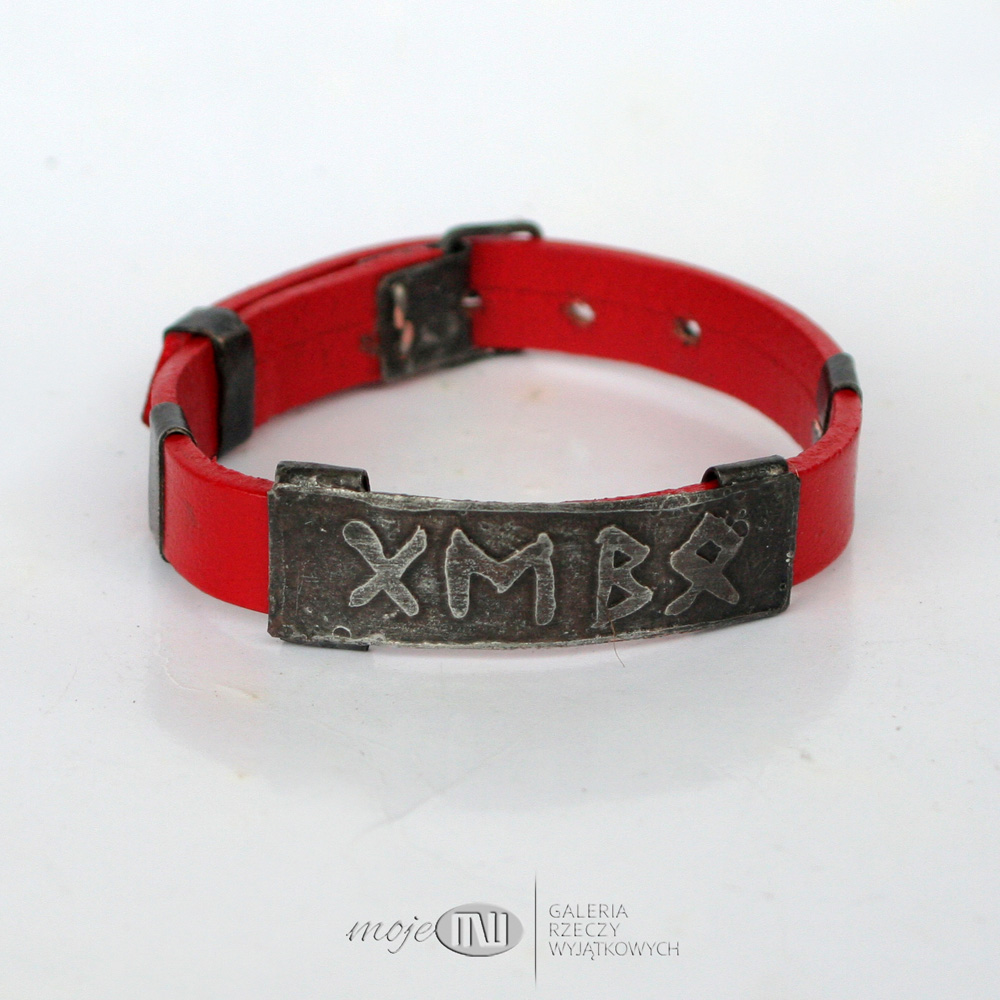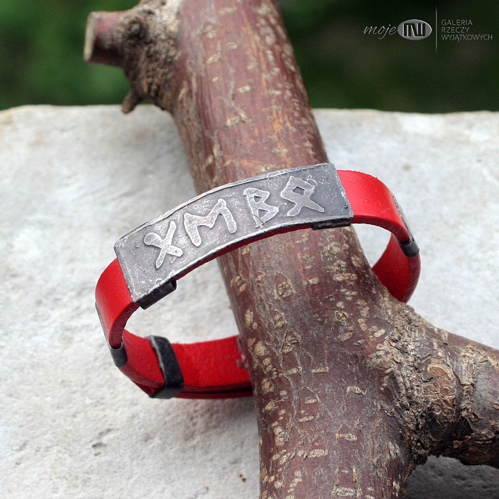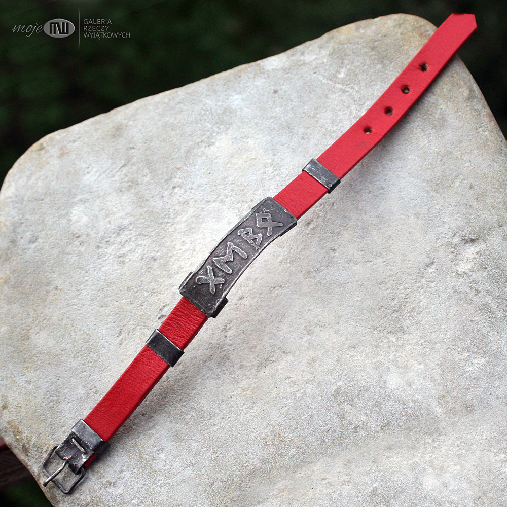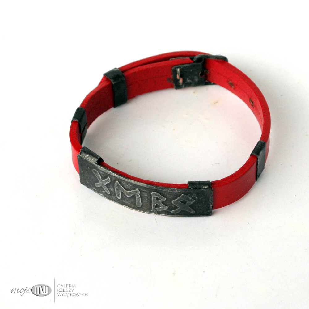 Energetyczna runiczna bransoleta z miedzi i skórzanego rzemienia w czerwonym kolorze.