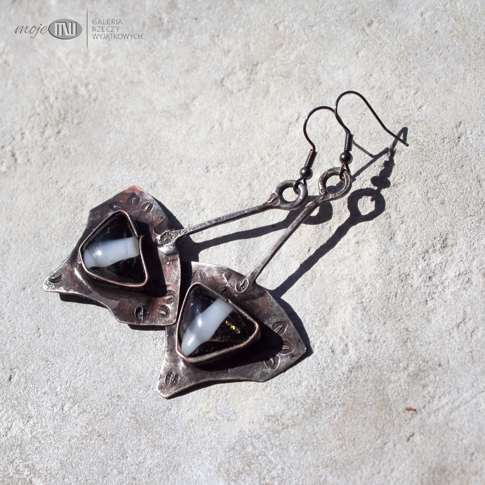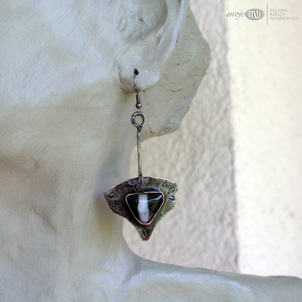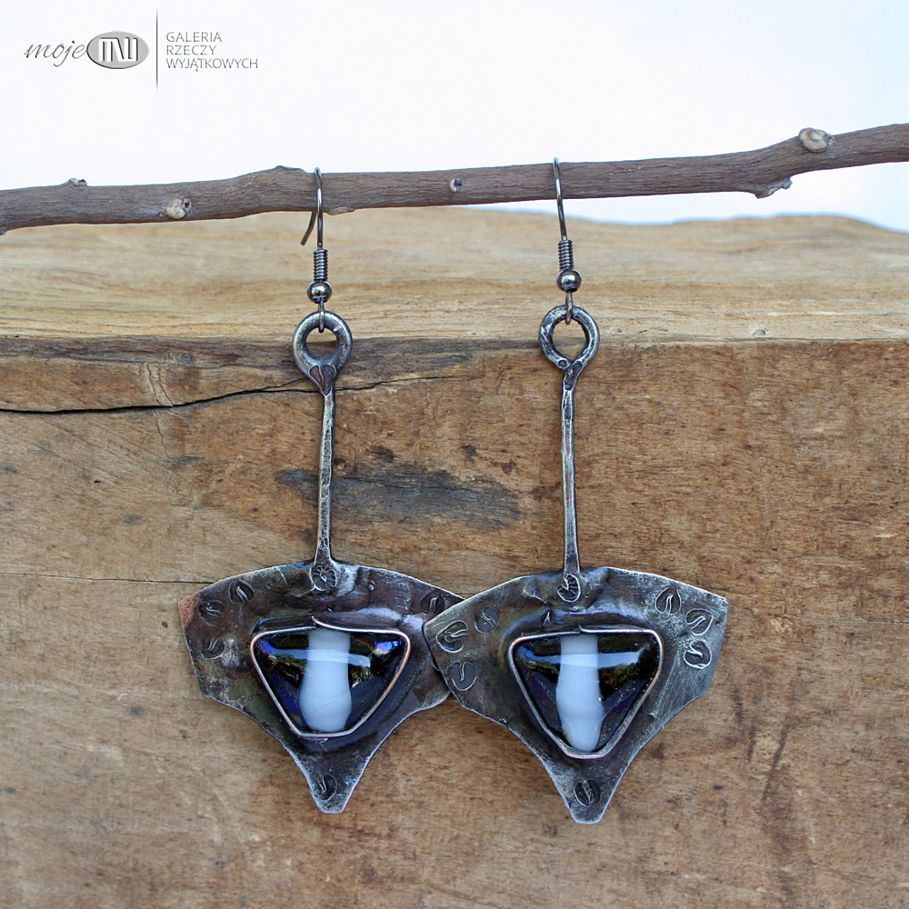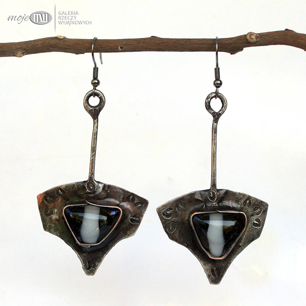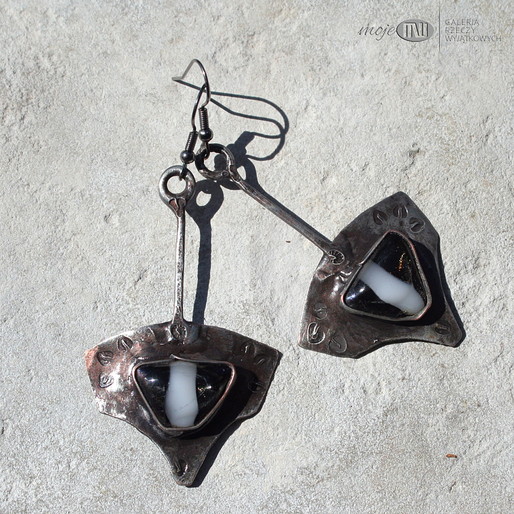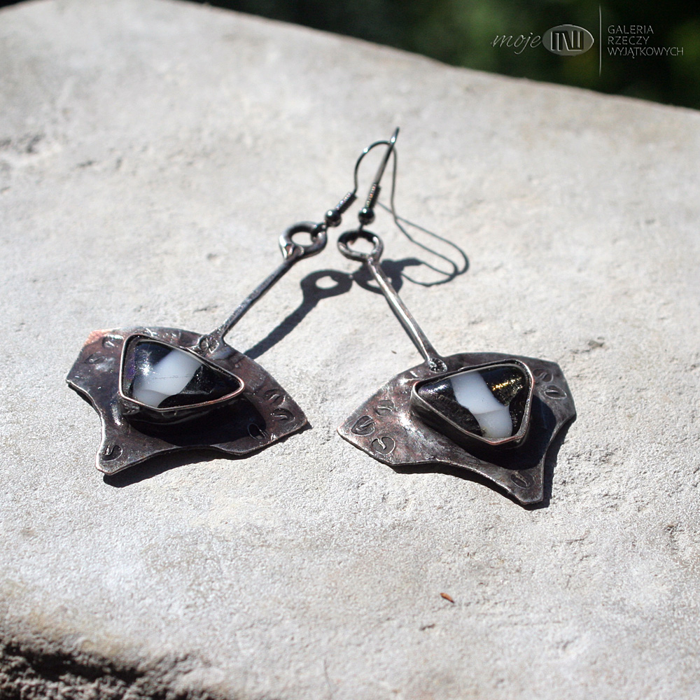 Kolczyki z miedzi pokrytej cyną, patynowanej i przecieranej. Gdzieniegdzie wybiłam stemplem małe znaczki. Zdobią je kaboszony, które wytopiłam ze szkła dichroicznego, które delikatnie połyskuje "wewnątrz". Zawieszone na metalowych biglach w kolorze grafitowym.