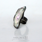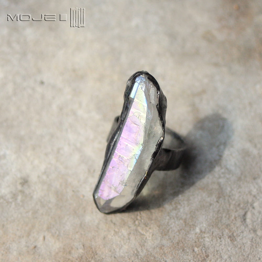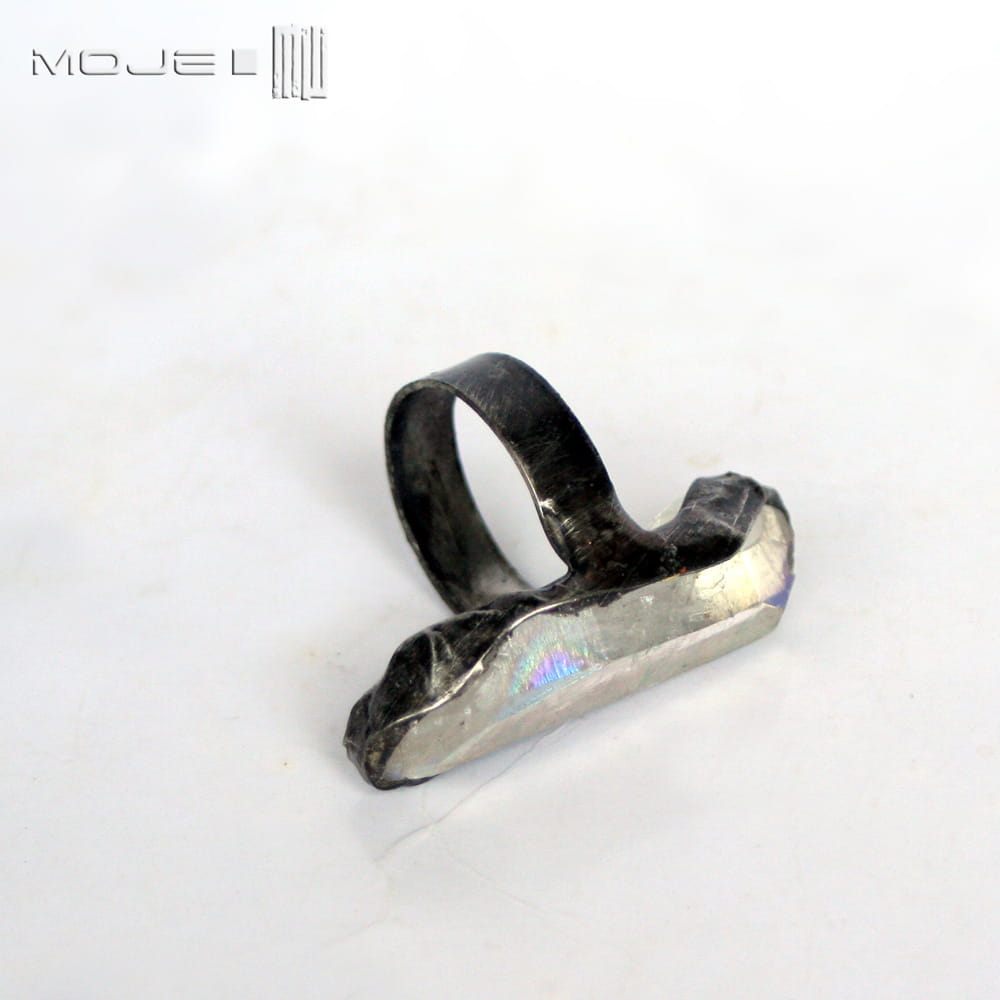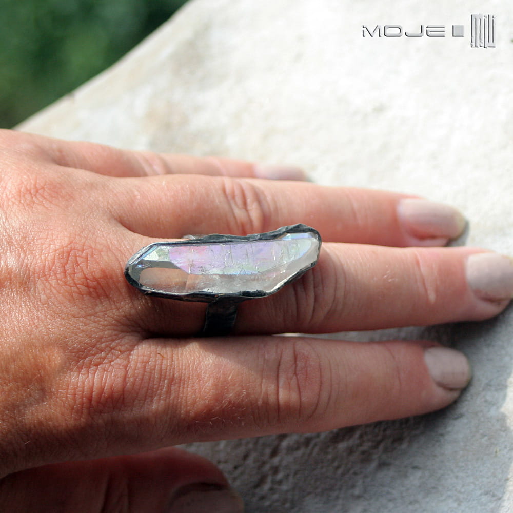 Pierścień z surową bryłą przejrzystego kryształu górskiego z aurą anielską. Oprawiony jest dość minimalistycznie w cynowaną, patynowaną i przecieraną miedź. Anielska aura sprawia, że kamień delikatnie połyskuje tęczowo.