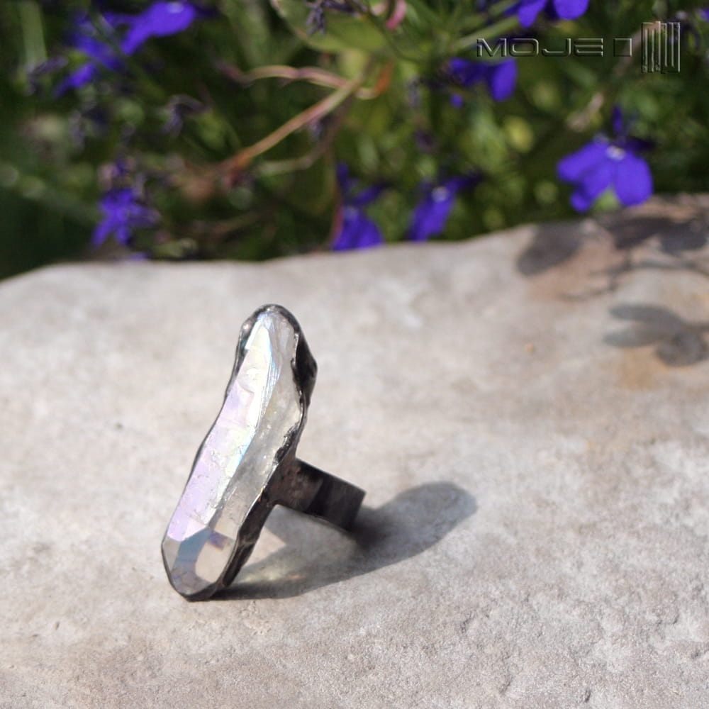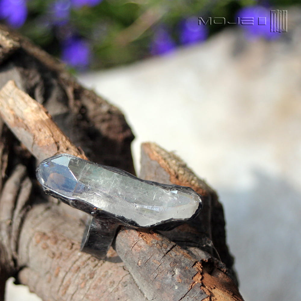 Pierścień z surową bryłą przejrzystego kryształu górskiego z aurą anielską.