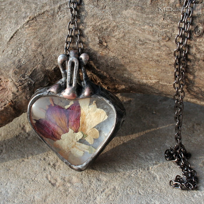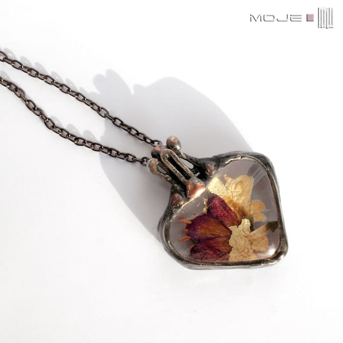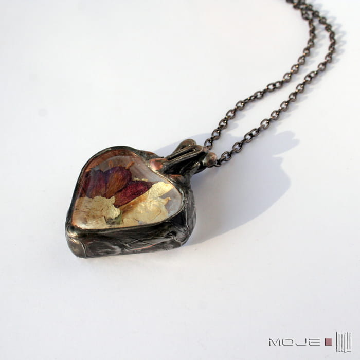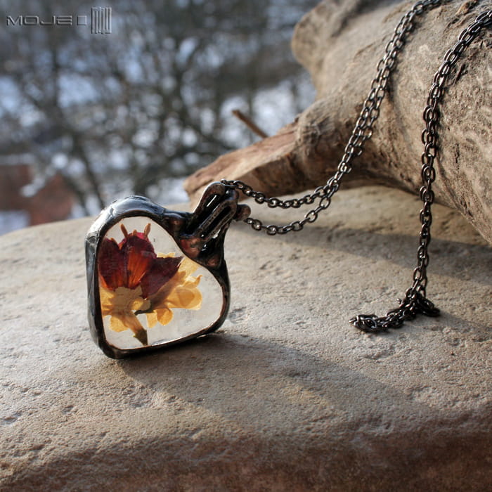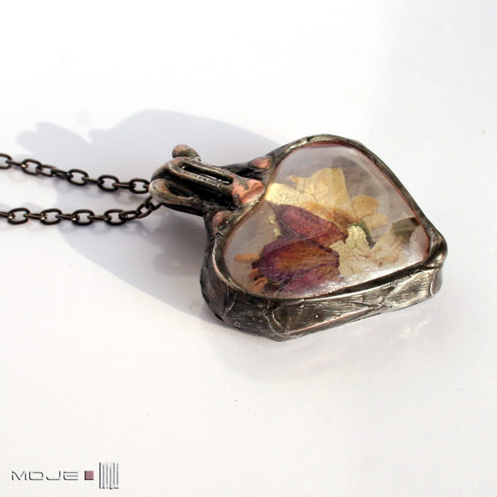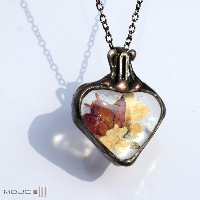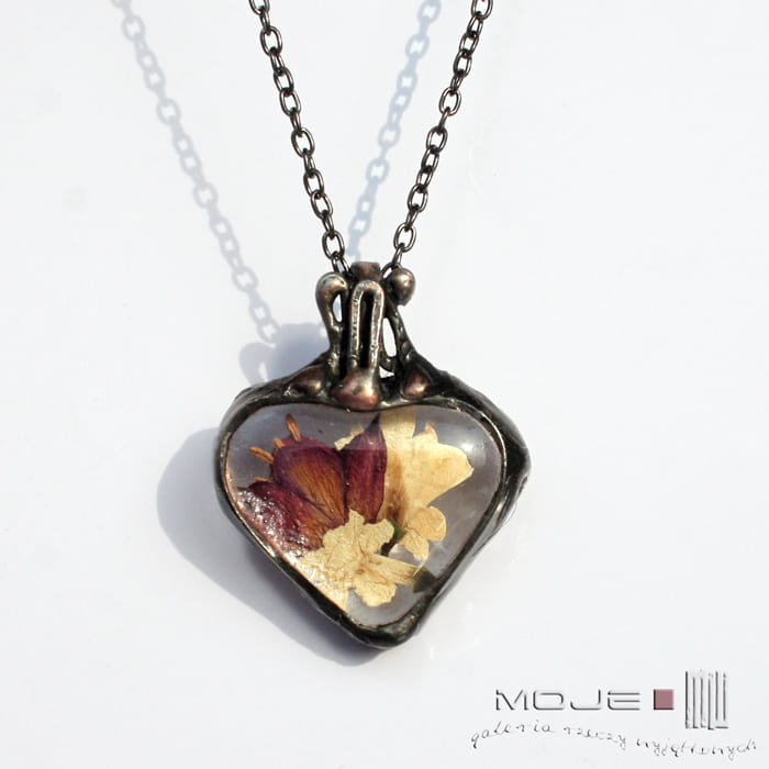 Czarowny wisior-zielnik w kształcie serca z zamkniętym w jego wnętrzu fragmentem lata. Suszone kwiaty fuksji i białego bzu zamknięte są między dwoma taflami bezbarwnego szkła. Górne szkło wytopiłam metodą fusingu w kilkuset stopniach i dzięki temu jest lekko wypukłe. Całość oprawiona jest w miedź - cynowaną, patynowaną i przecieraną. Wisior zawieszony jest na łańcuszku w kolorze grafitowym.