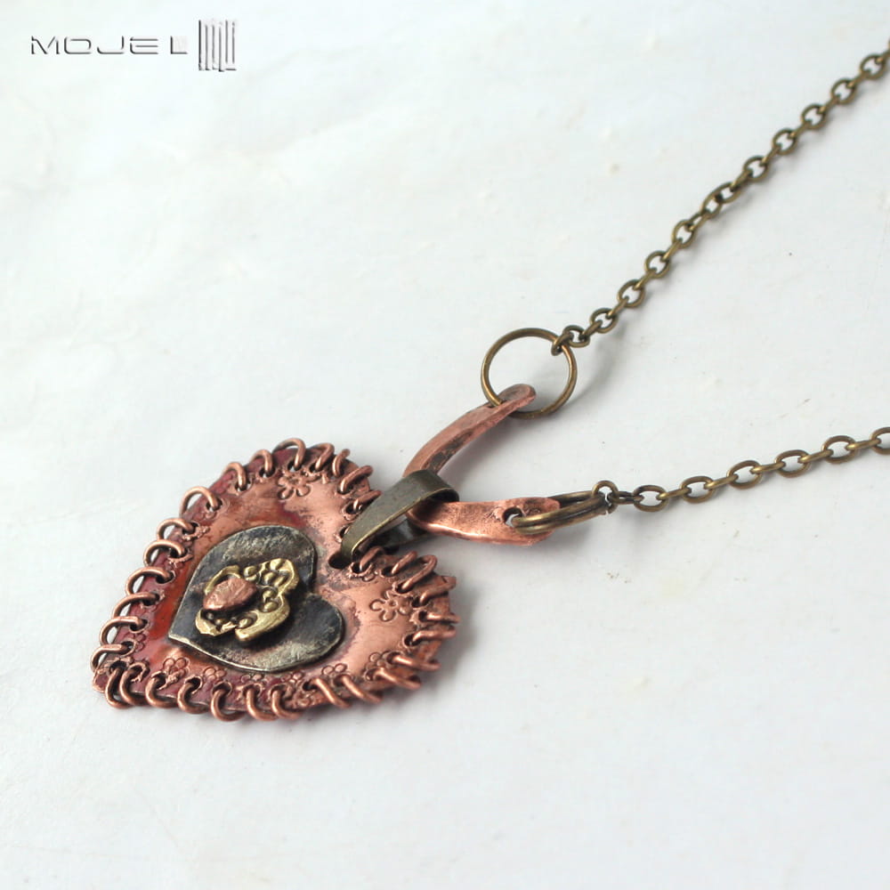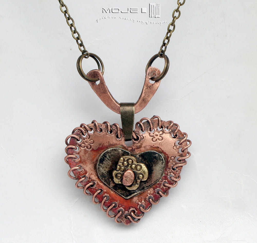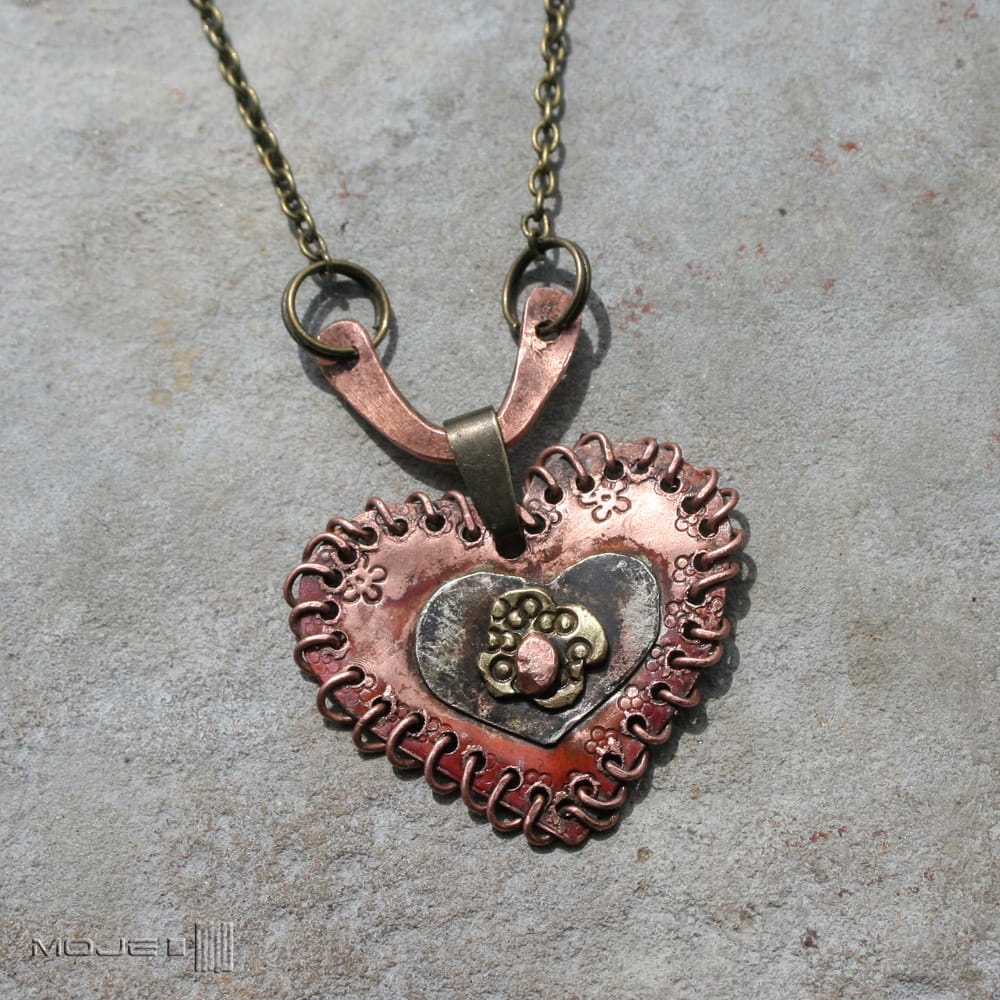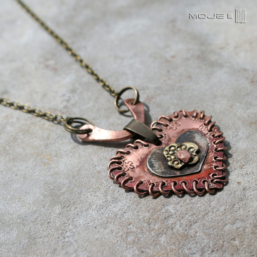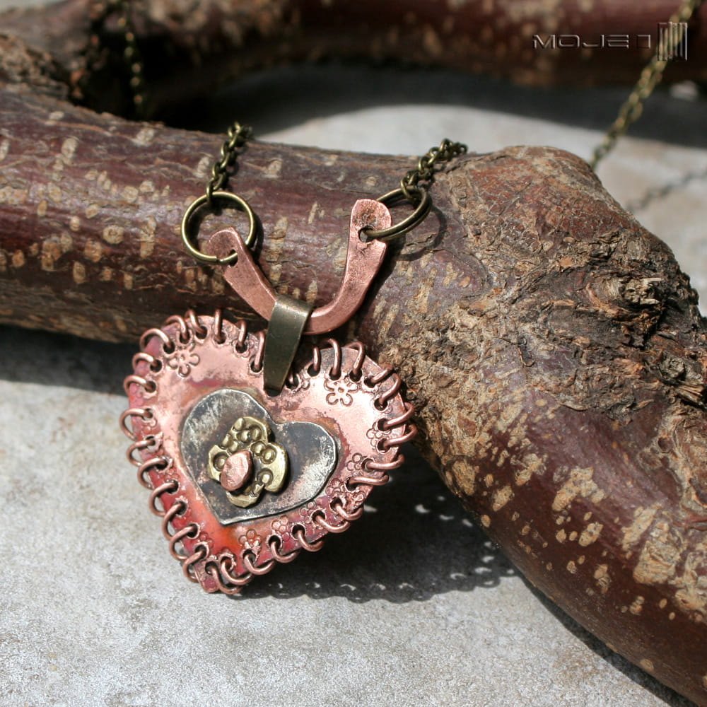 Wisior w kształcie serca - zrobiłam go z trzech rodzajów blachy - miedzi, alpaki i mosiądzu. Ozdobione jest drobnymi tłoczonymi kwiatuszkami, a rustykalnego charakteru dodaje mu "obszycie" miedzianym drutem. Serce jest częściowo młotkowane, patynowane i przetarte dla wydobycia faktury.