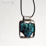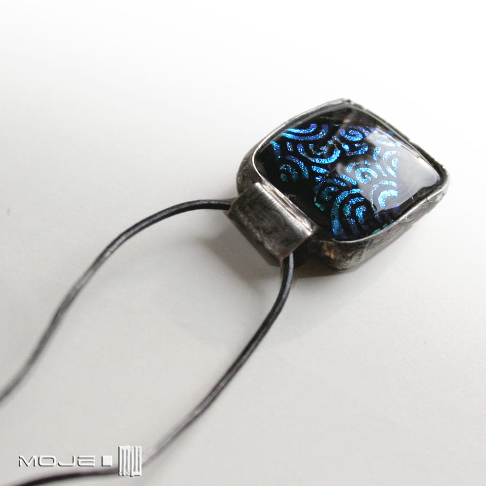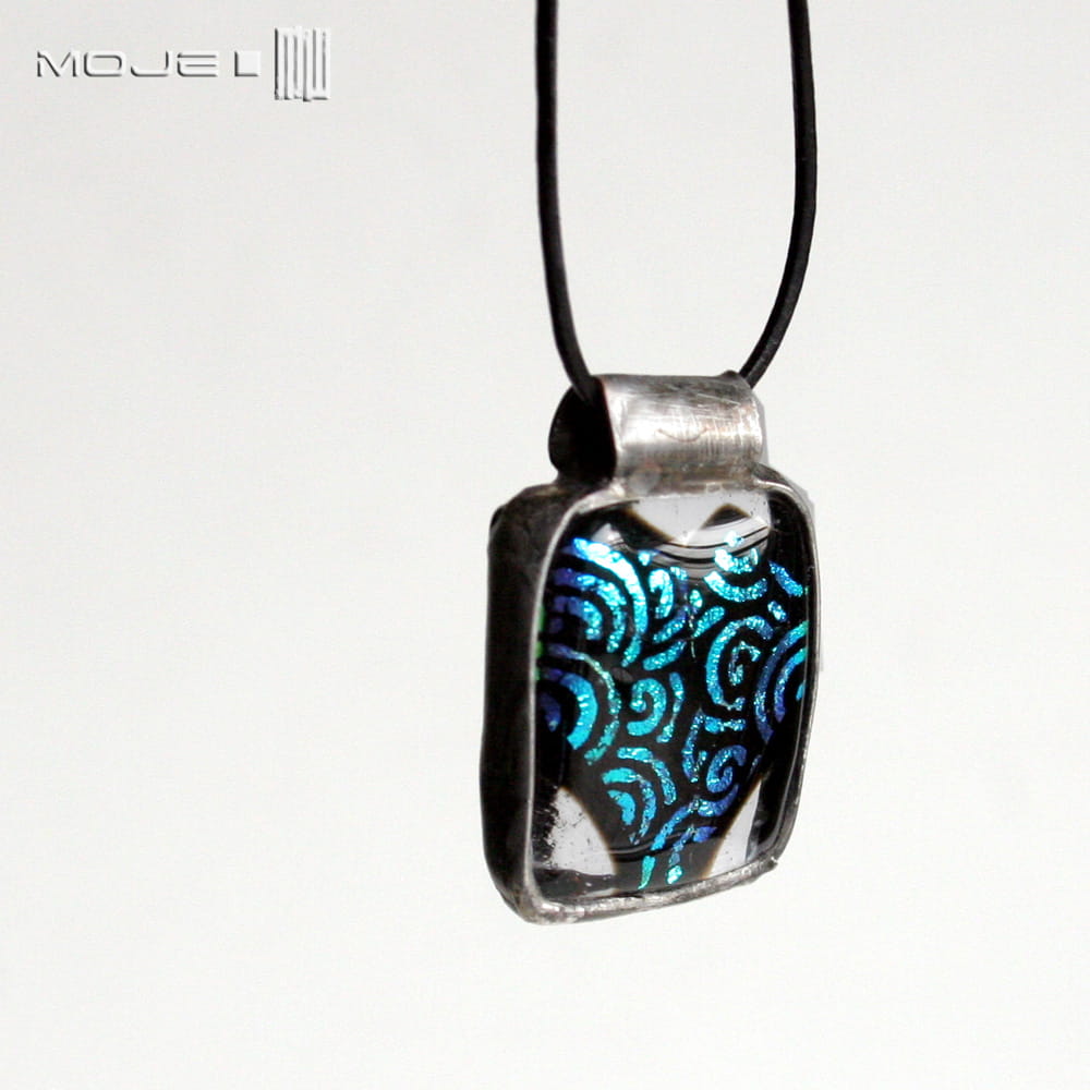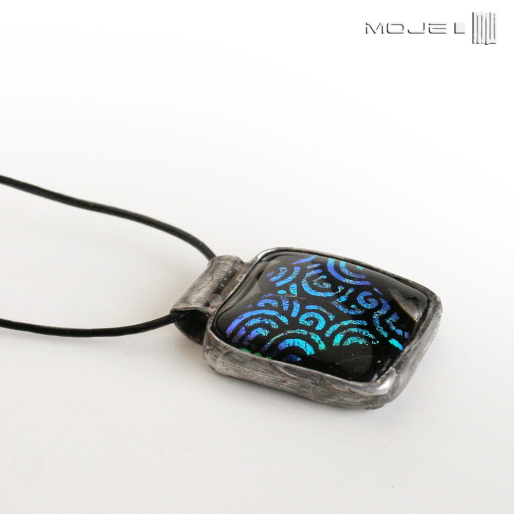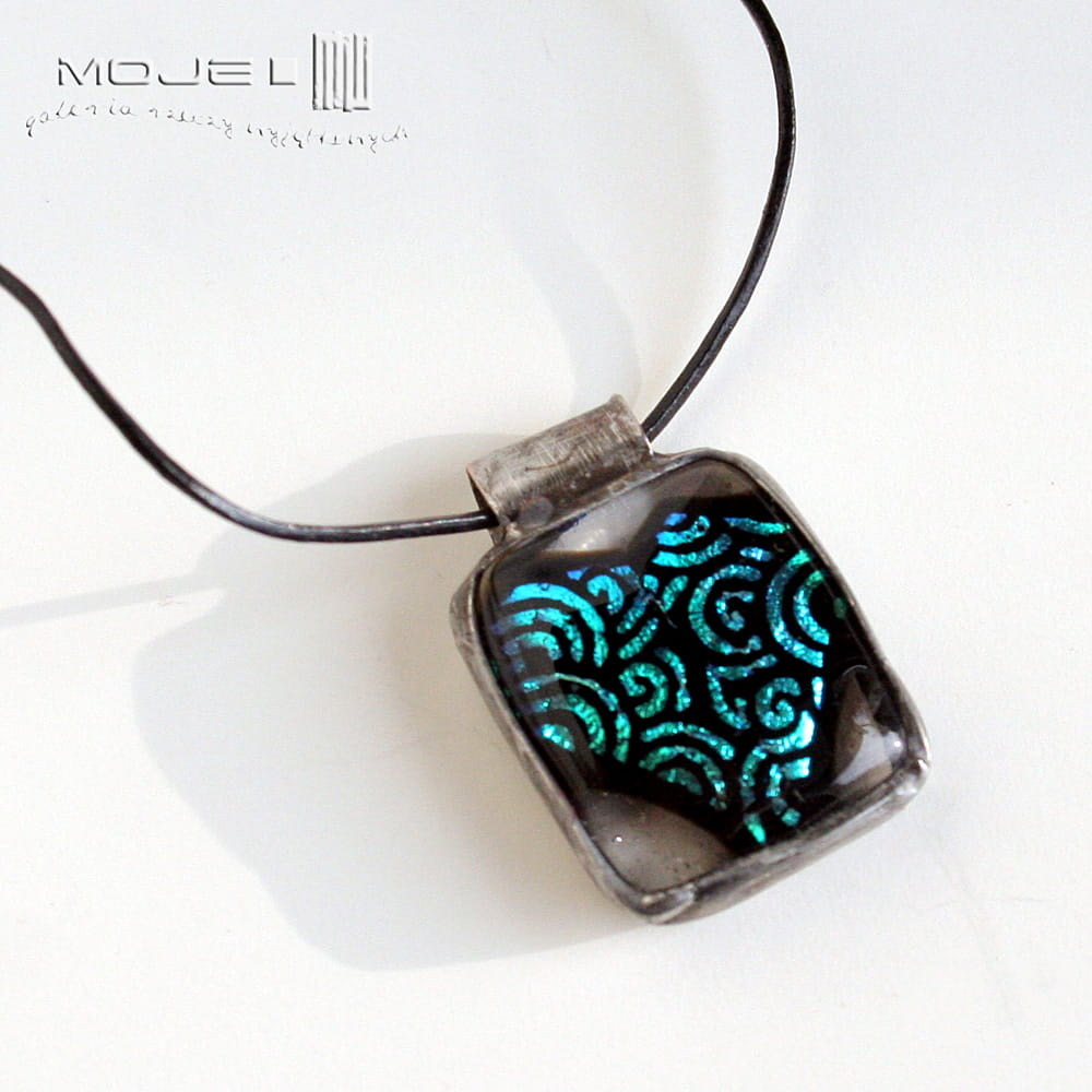 Szklany, prawie prostokątny wisiorek. Wytopiłam go metodą fusingu ze szkła dichroicznego, które opalizuje i mieni się w świetle. Można uznać, że jest to zakamuflowane serce - kształtu troszkę trzeba się doszukać, ale wisiorek jest dekoracyjny i przyciągający oko. Zawieszony jest na cienkim skórzanym rzemyku (1 mm), delikatna regulacja długości.