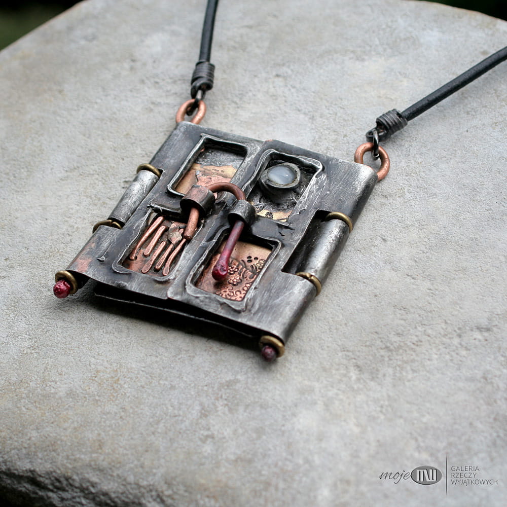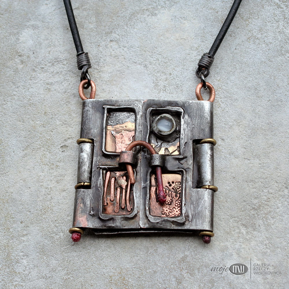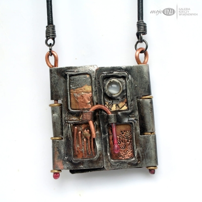 Wisior z miedzi i mosiądzu. Metal jest częściowo młotkowany, tłoczony i wybijany stemplami, miejscami pokryty cyną i patynowany.