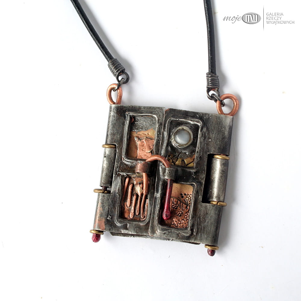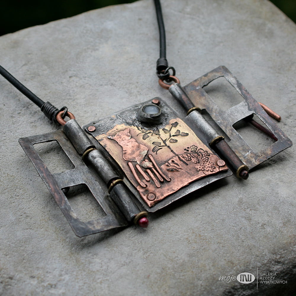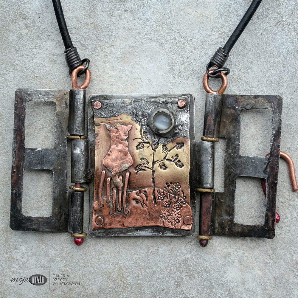 Wisior z miedzi i mosiądzu z sielskim obrazkiem.