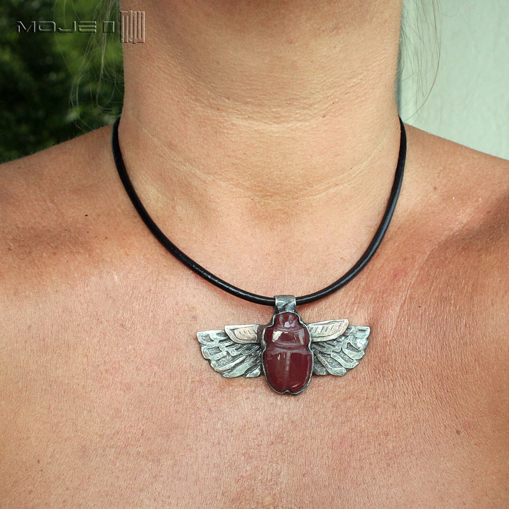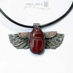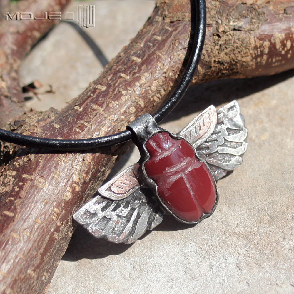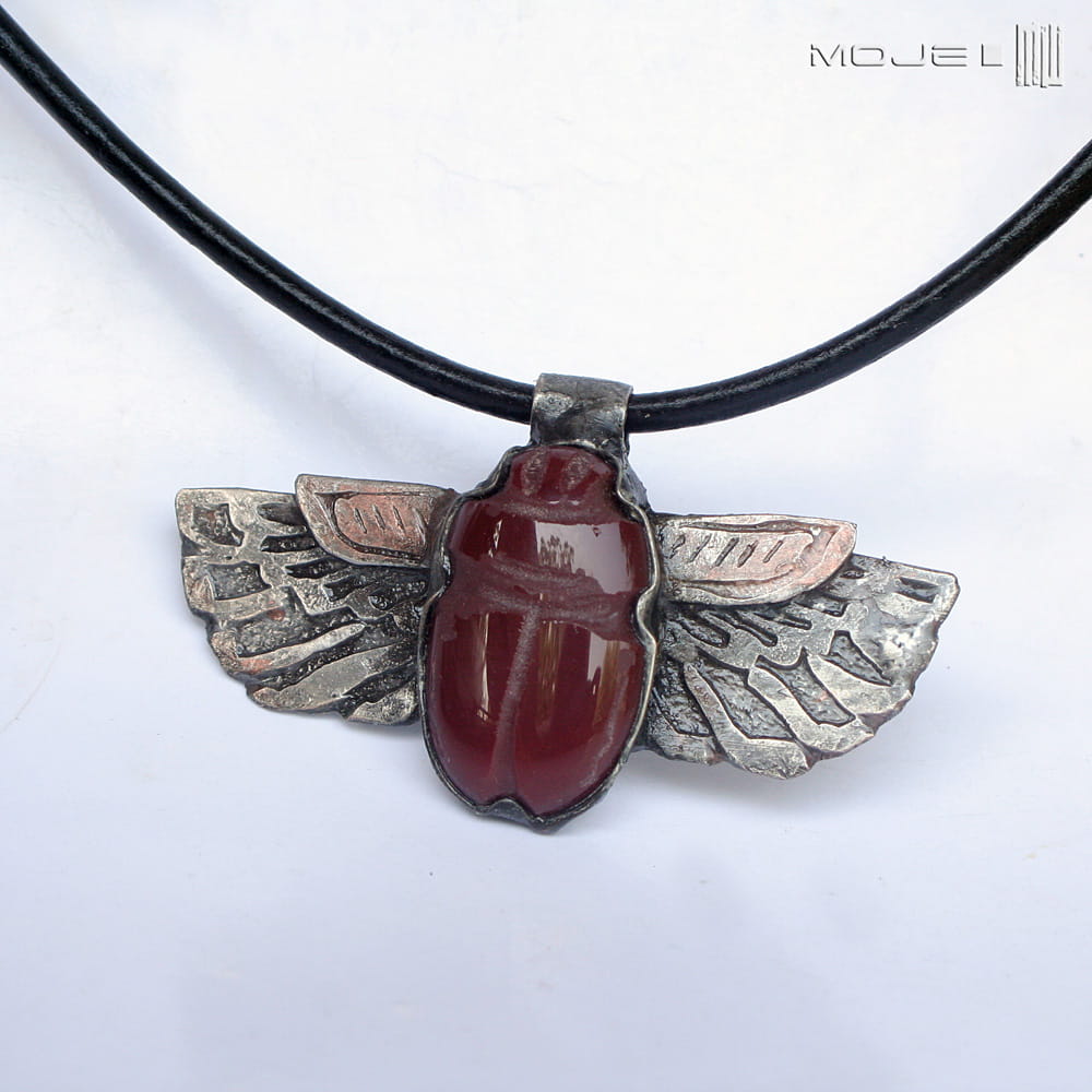 Wzór zaczerpnęłam bezpośrednio z egipskiej sztuki. Delikatnie podszlifowany kaboszon wytopiony z bordowo-burgundowego szkła, dający zarysy żuka. Skrzydła są z trawionej miedzi, a całość jest pokryta patynowaną i przecieraną cyną.