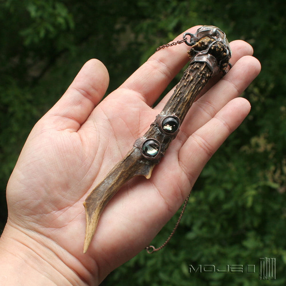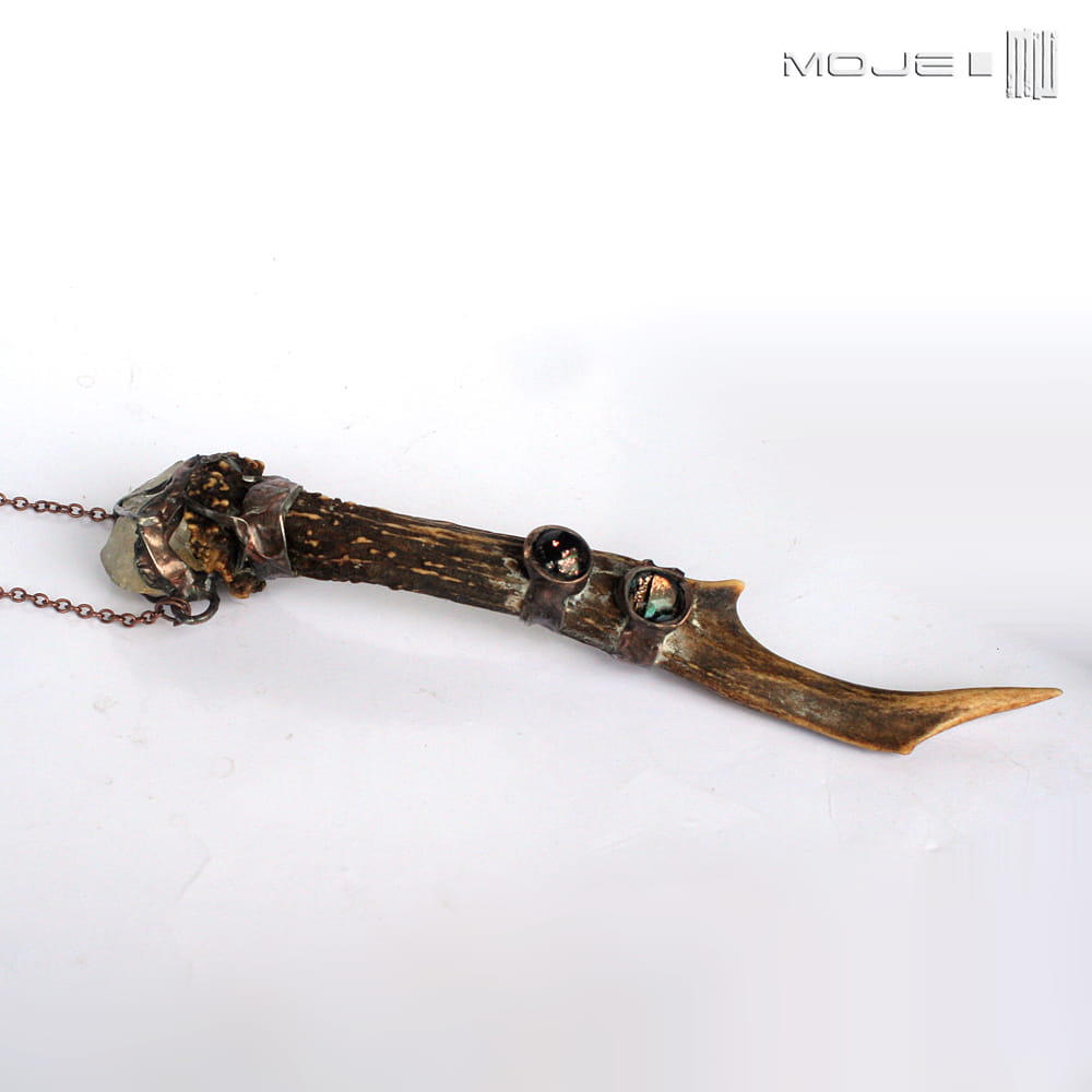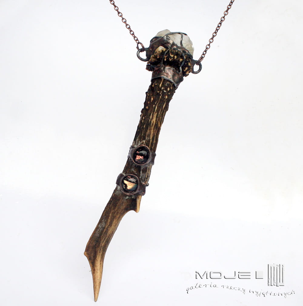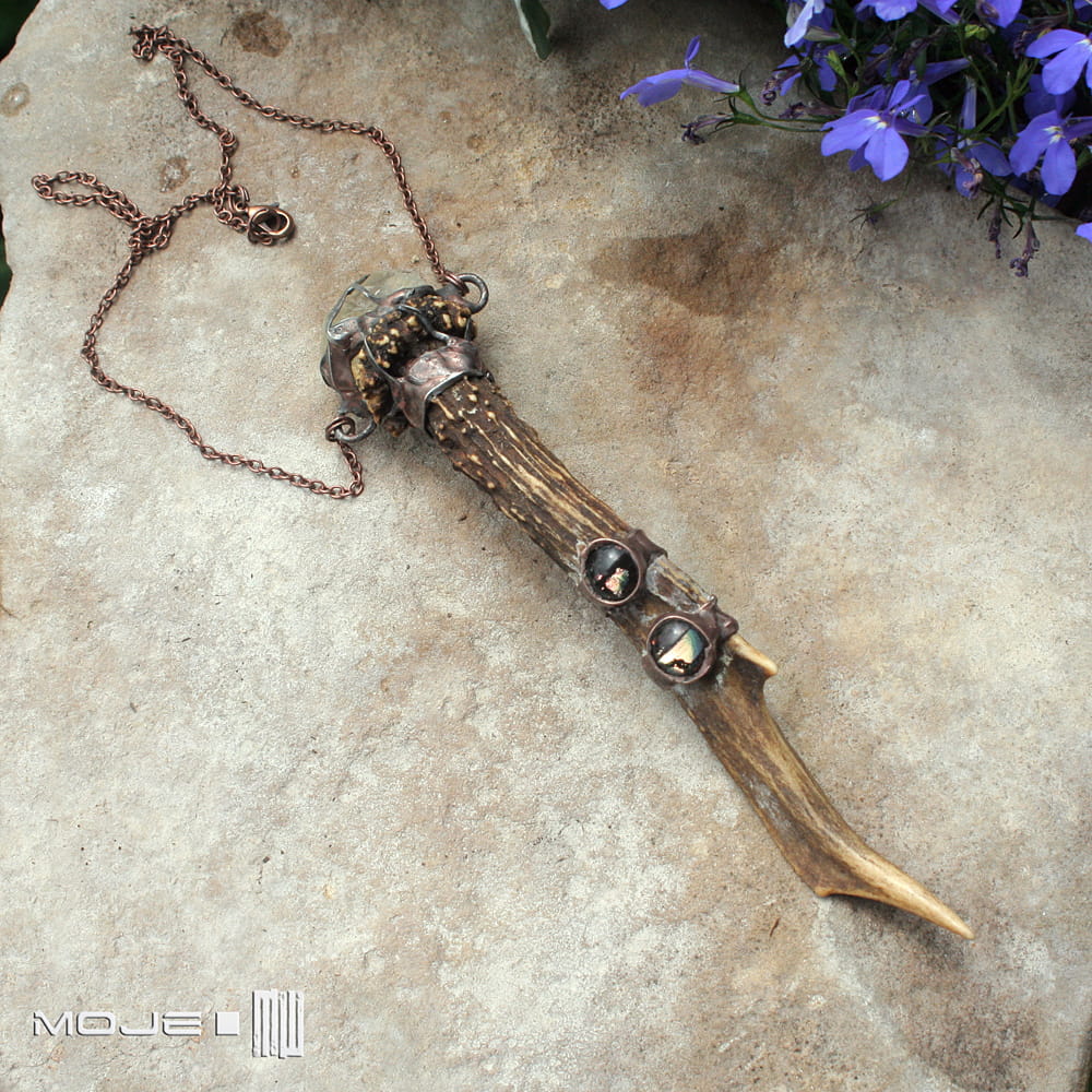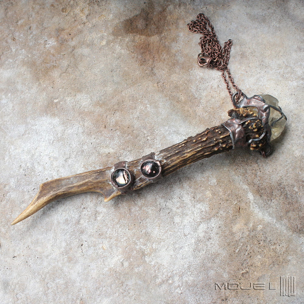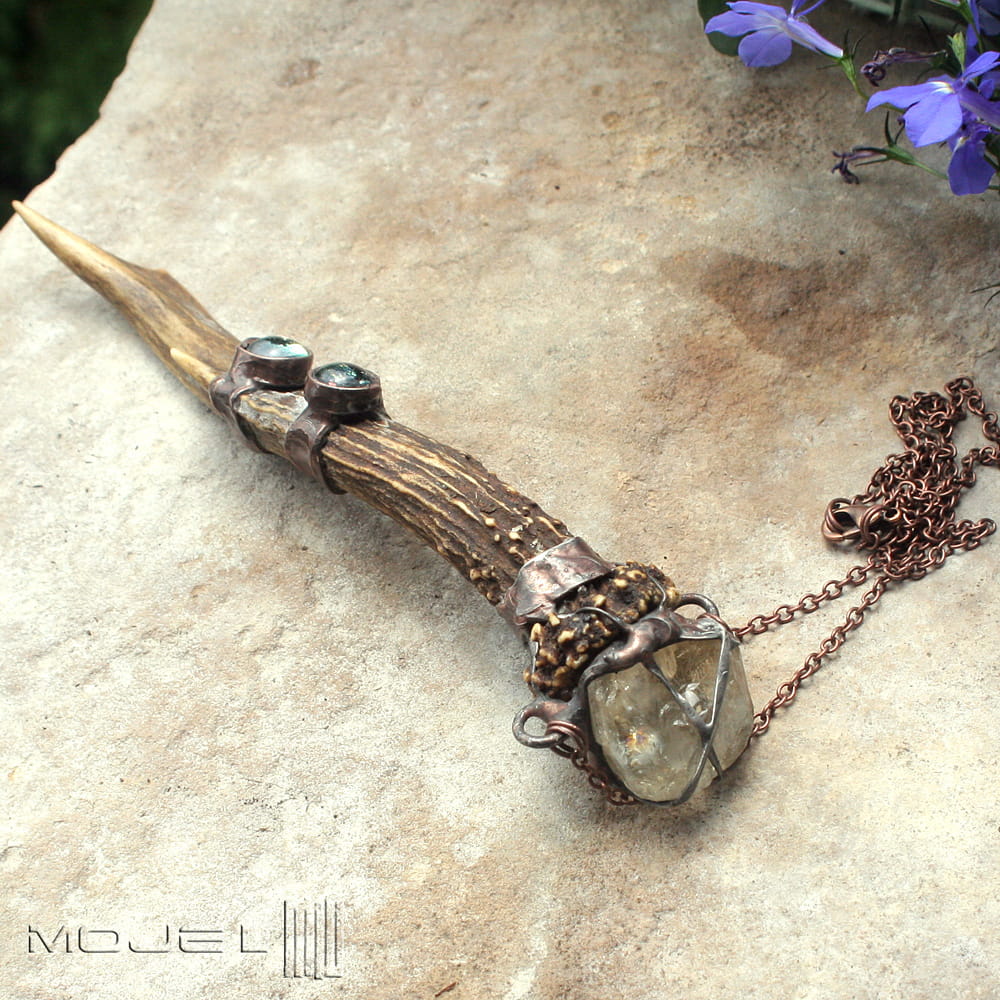 Magiczny wisior dla lubiących leśne legendy i opowieści o skrzatach. Zrobiłam go z parostka (pierwsze rogi koziołka sarny, które zrzuca jesienią) oraz surowej bryłki cytrynu. Dodatkową ozdobą są dwa małe kaboszony, które wytopiłam ze szkła dichroicznego. Całość oprawiona jest w miedź - cynowaną, patynowaną i przecieraną.