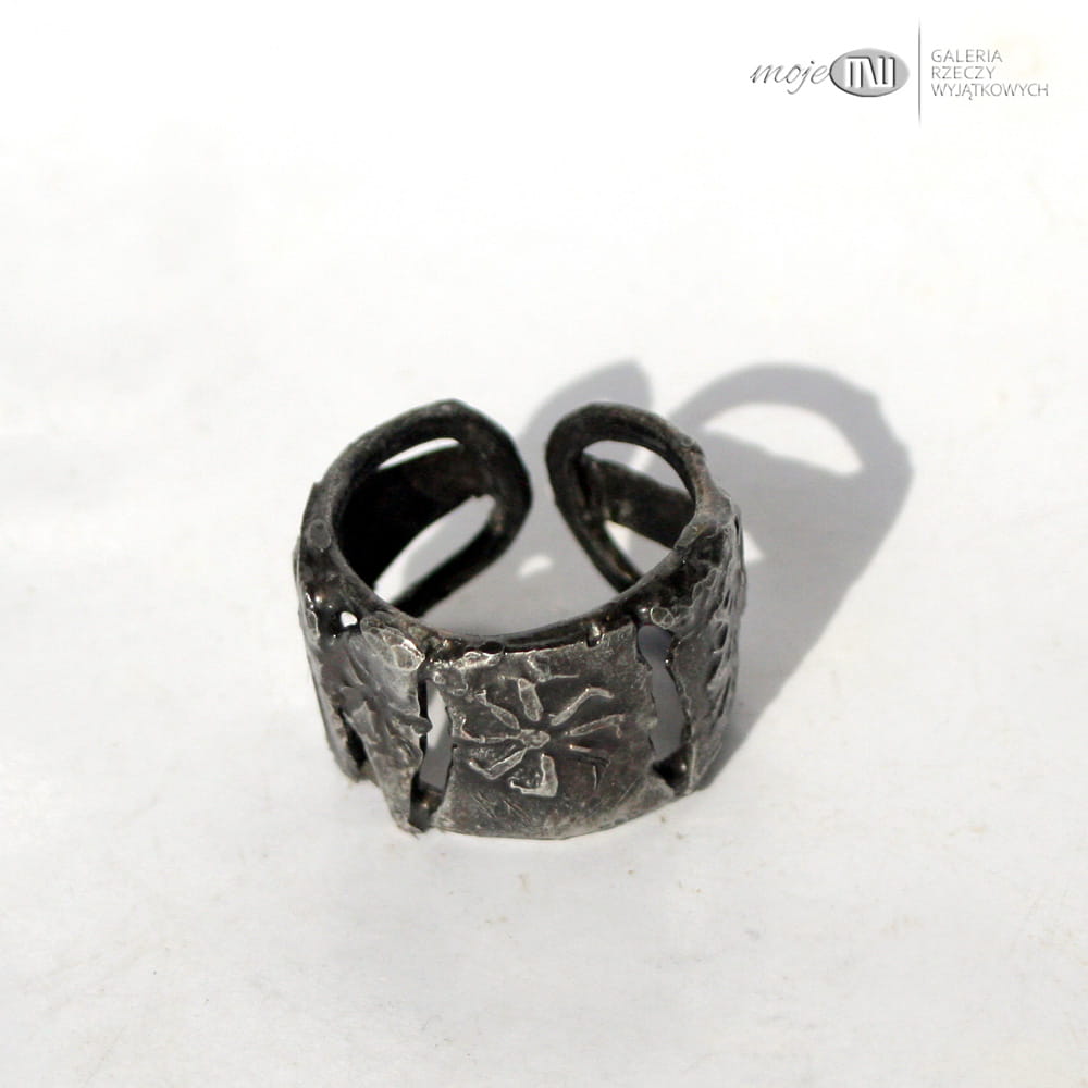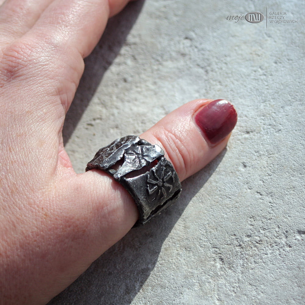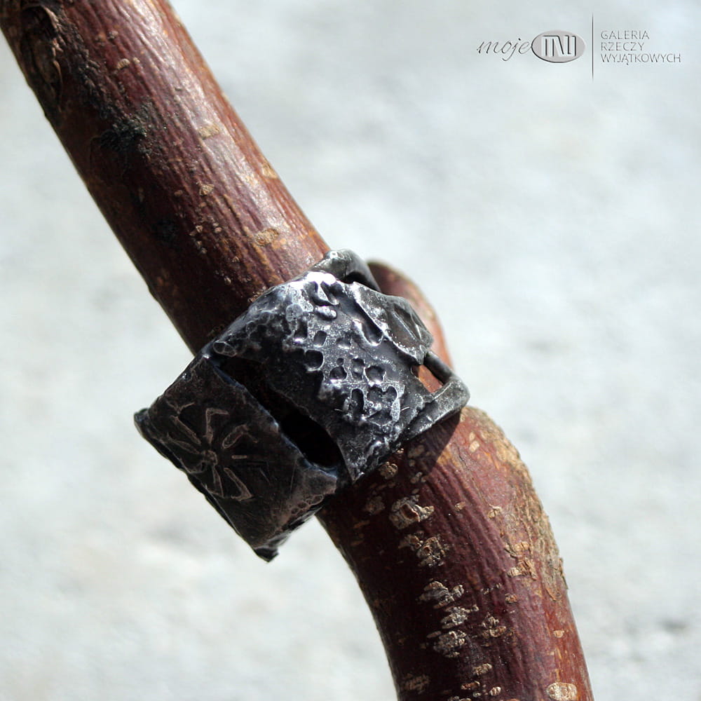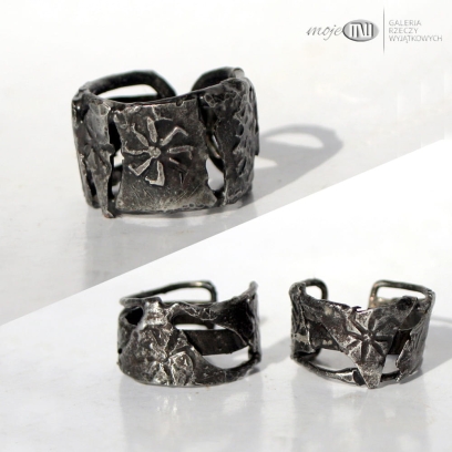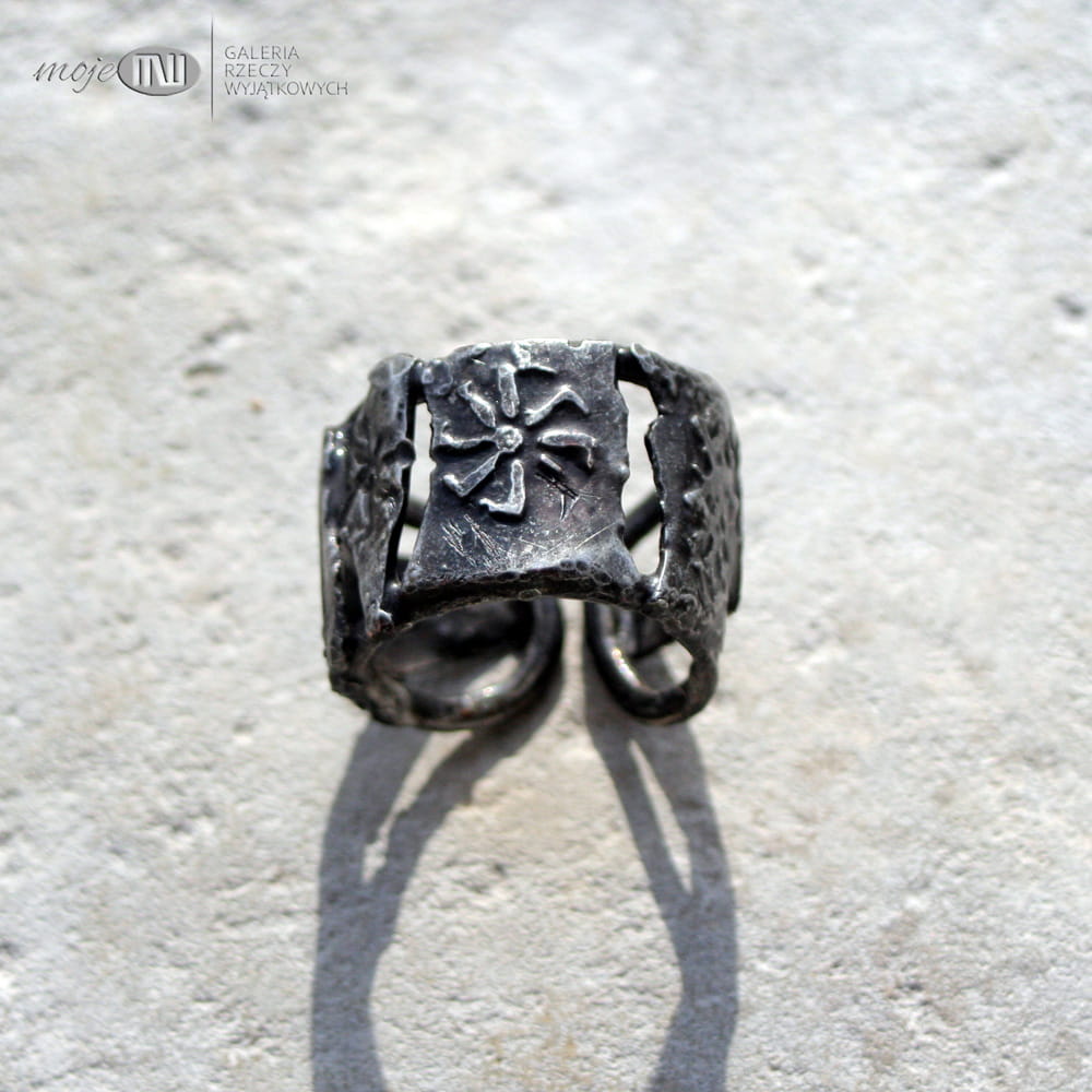 Komplet - obrączka i nausznice ze znakiem Swarożyca oraz innymi bliżej nieokreślonymi wzorami. Zrobione są z trawionej miedzianej blachy pokrytej cyną i patynowanej dla uzyskania efektu postarzenia. Całość jest surowa i rustykalna - idealna jako biżuteria dla mężczyzny.