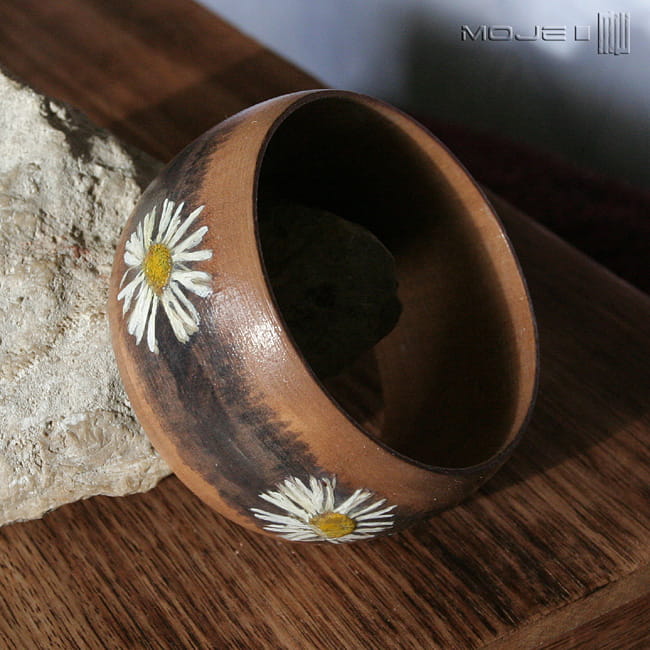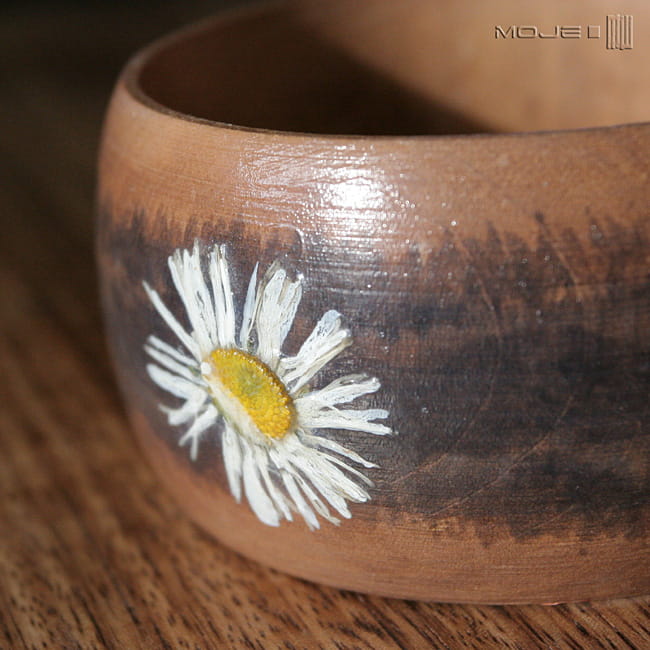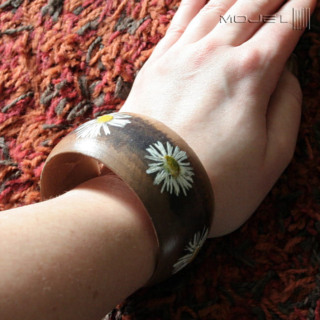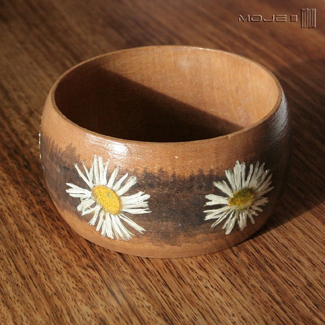Drewniana szeroka bransoleta z kwiatami stokrotki. Ciepła kolorystyka. Z upływem czasu kolor suszonych kwiatów może stać się mniej intensywny. Zabezpieczone wodnym bezbarwnym lakierem.