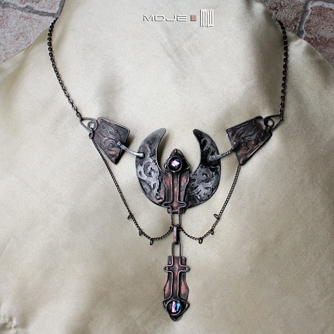 Duży i efektowny naszyjnik w stylu gotyckim, inspirowany magią, fantastyką i ezoteryką. Elementy lunarne łączą się z trawionymi motywami roślinnymi. Ozdobą są szklane oczka wytopione przeze mnie ze szkła dichroiczego.