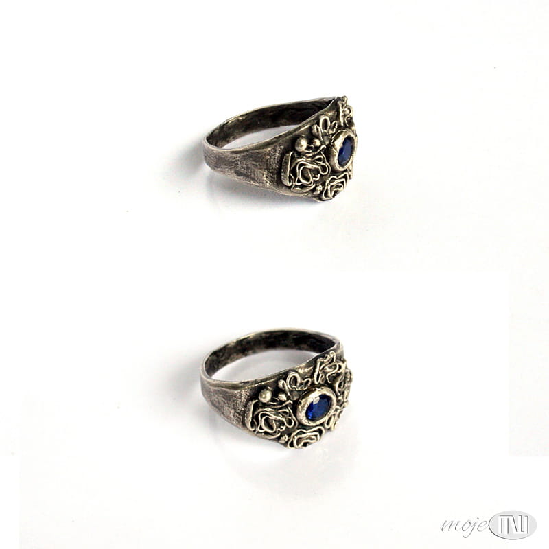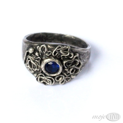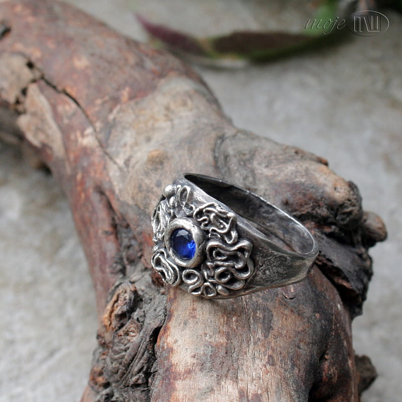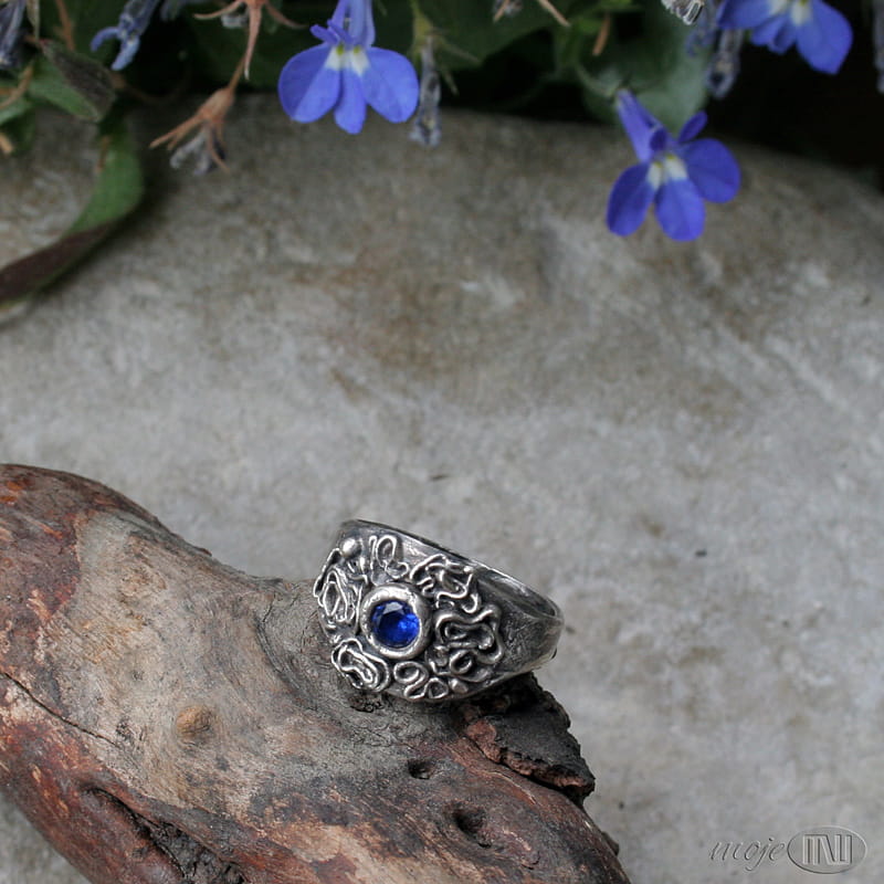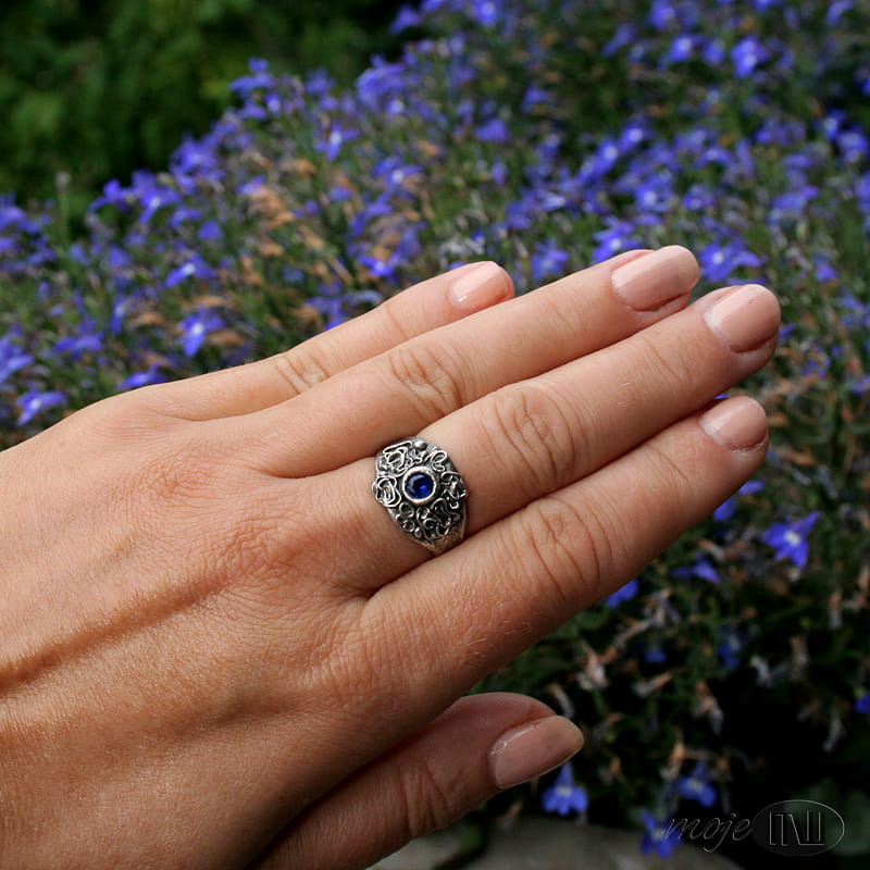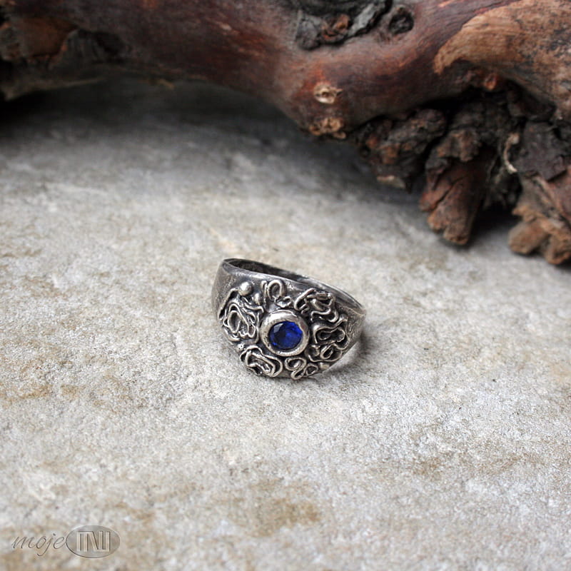 Pierścionek zrobiłam ręcznie ze srebra próby min. 925. W centralnym punkcie pomiędzy srebrnymi zawijasami jest szafirowa cyrkonia. Srebro jest oksydowane i przecierane.