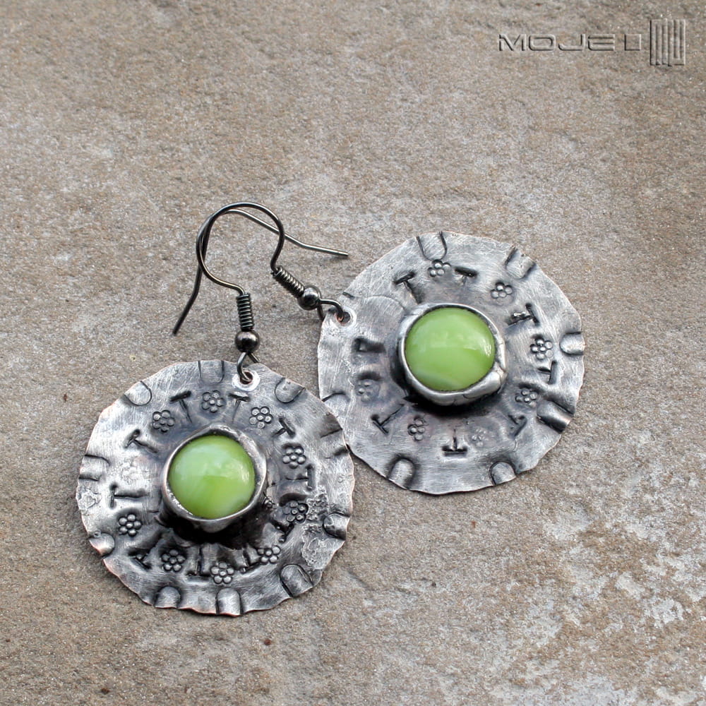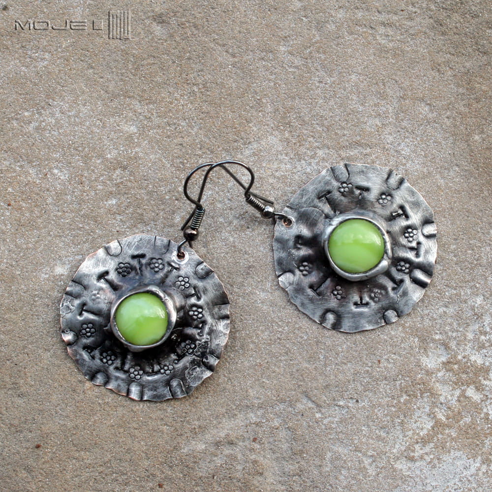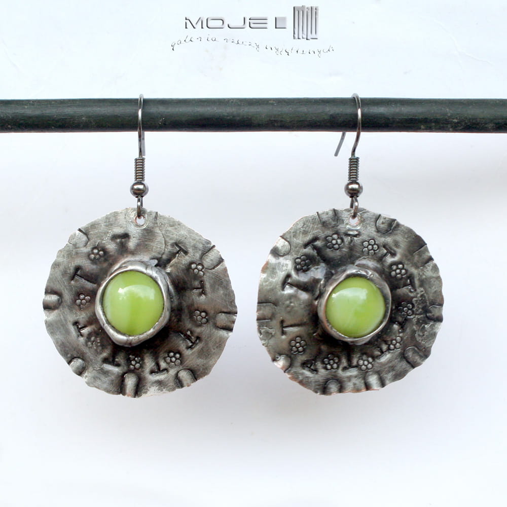 Miedziane okrągłe kolczyki ze szklanym okiem. Szklane kaboszony w jasnozielonym kolorze osadzone są na okrągłej miedzianej blasze z wybitymi znakami - młotkowanej, cynowanej, patynowanej i przecieranej. Blaszka jest cienka, a kolczyki dzięki temu lekkie. Metalowe bigle.