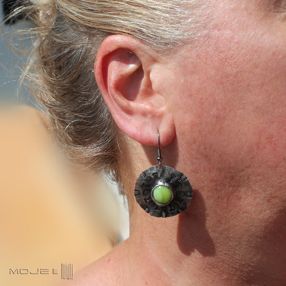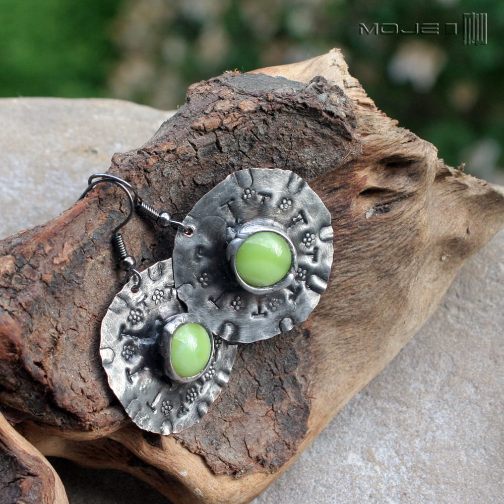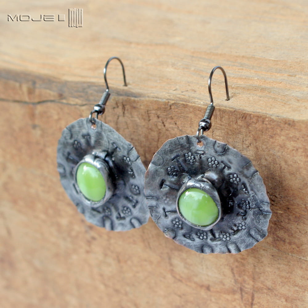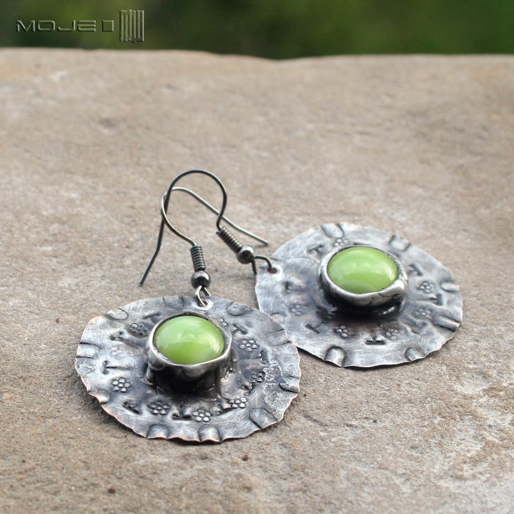 Miedziane okrągłe kolczyki ze szklanym okiem. Szklane kaboszony w jasnozielonym kolorze osadzone są na okrągłej miedzianej blasze z wybitymi znakami - młotkowanej, cynowanej, patynowanej i przecieranej. Blaszka jest cienka, a kolczyki dzięki temu lekkie. Metalowe bigle.