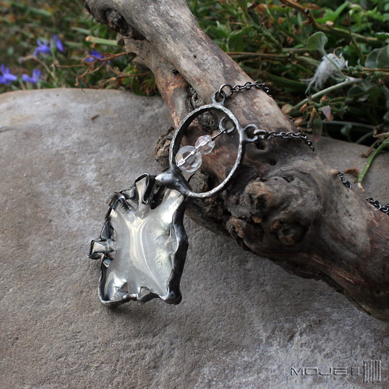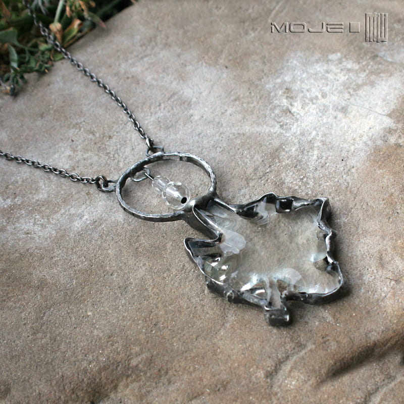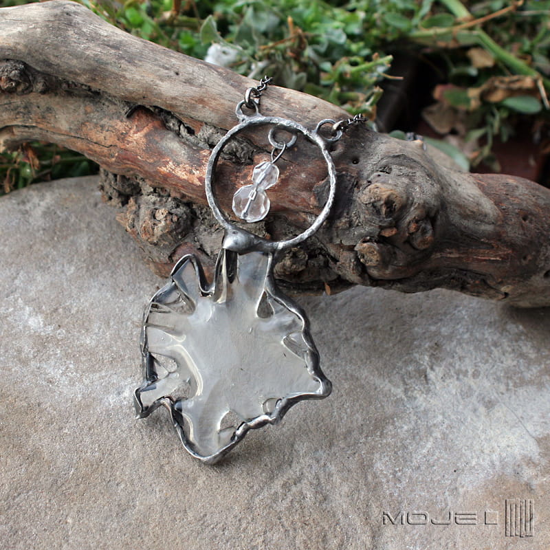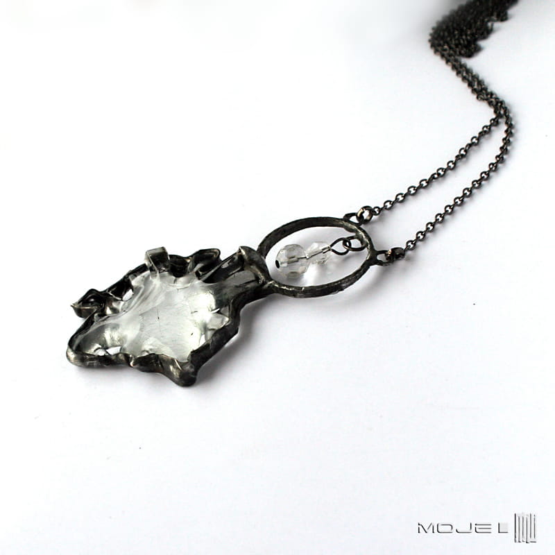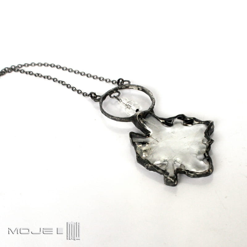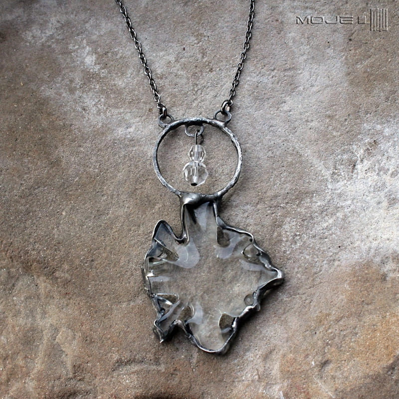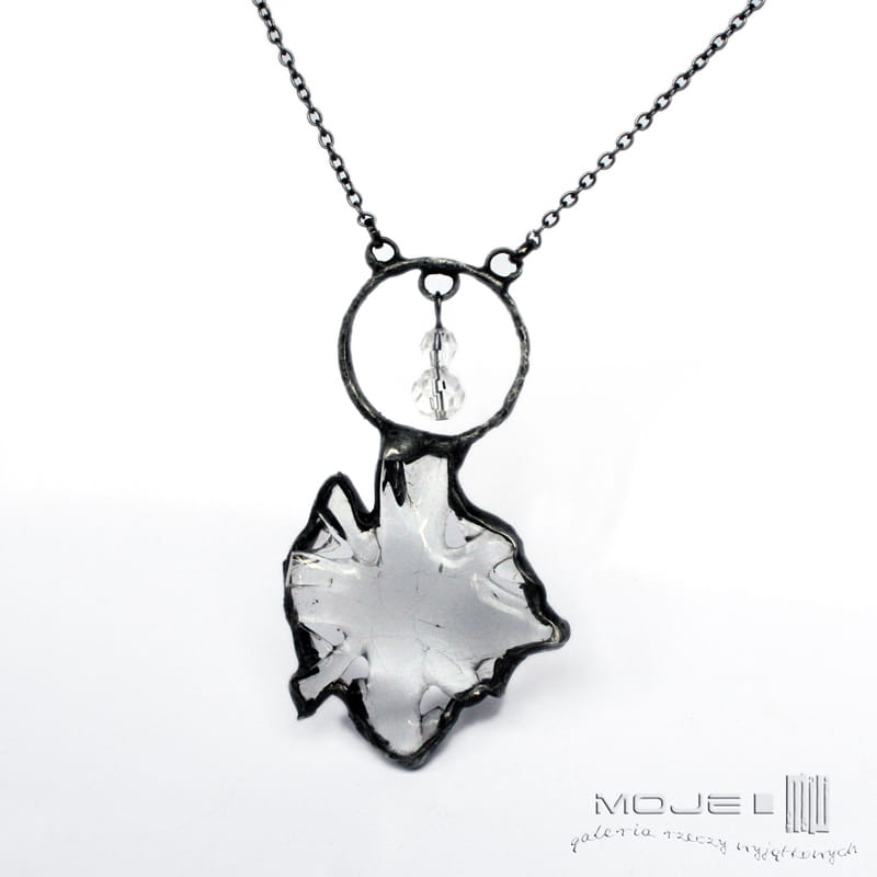 Wisior z bezbarwnego szkła, wytopiony przeze mnie metodą fusingu. Przedstawia znikającą i gubiącą swój charakterystyczny kształt śnieżynkę. Wisior oprawiony i wykończony jest miedzią - cynowaną, patynowaną i przecieraną. Zawieszony jest na łańcuszku w kolorze grafitowym o dł. 64 cm
