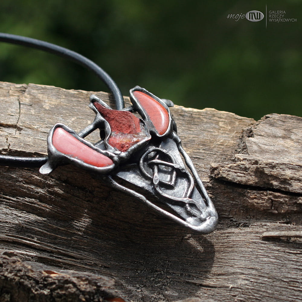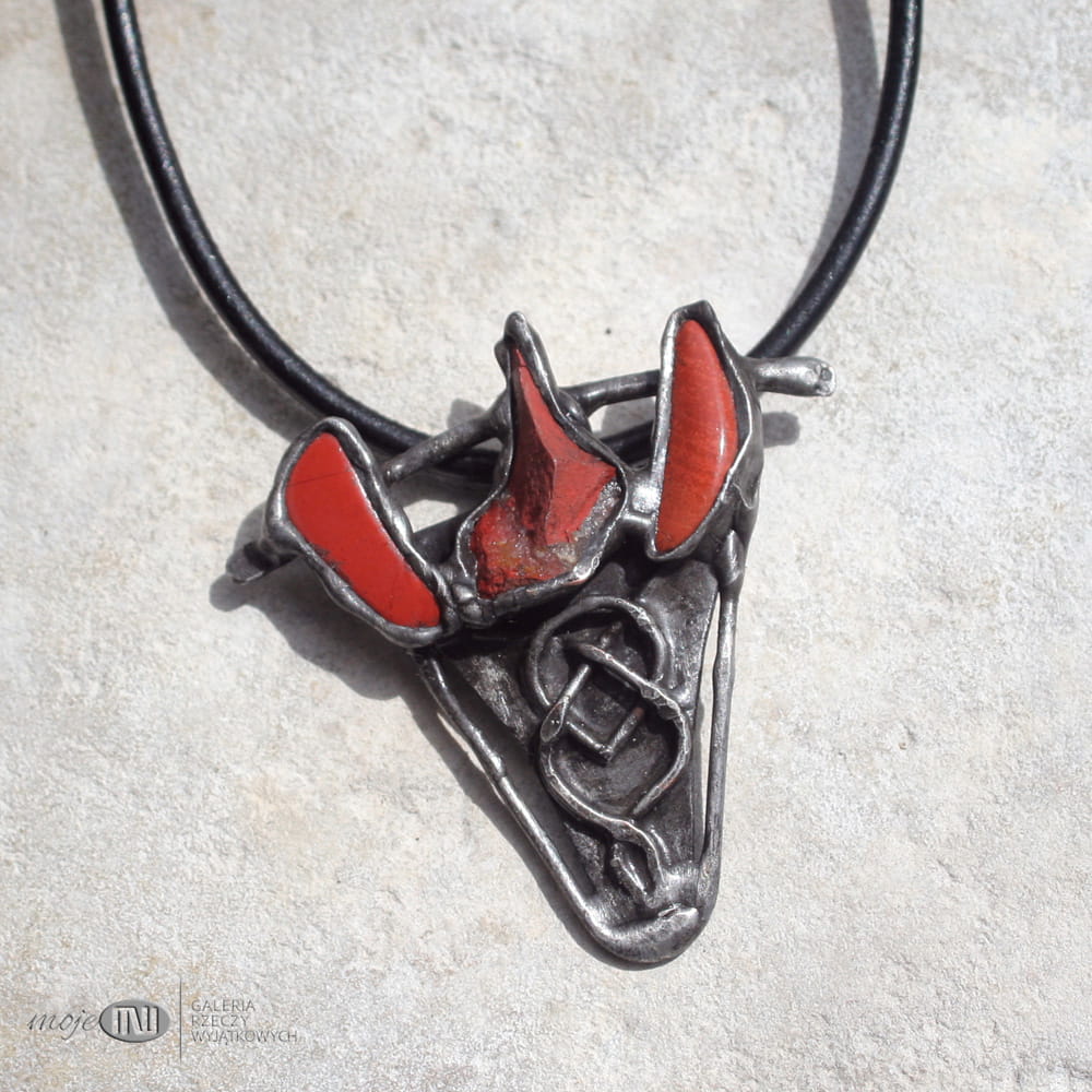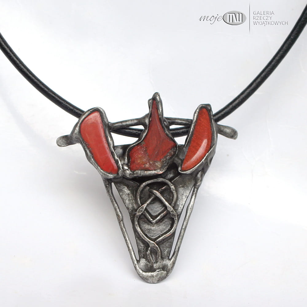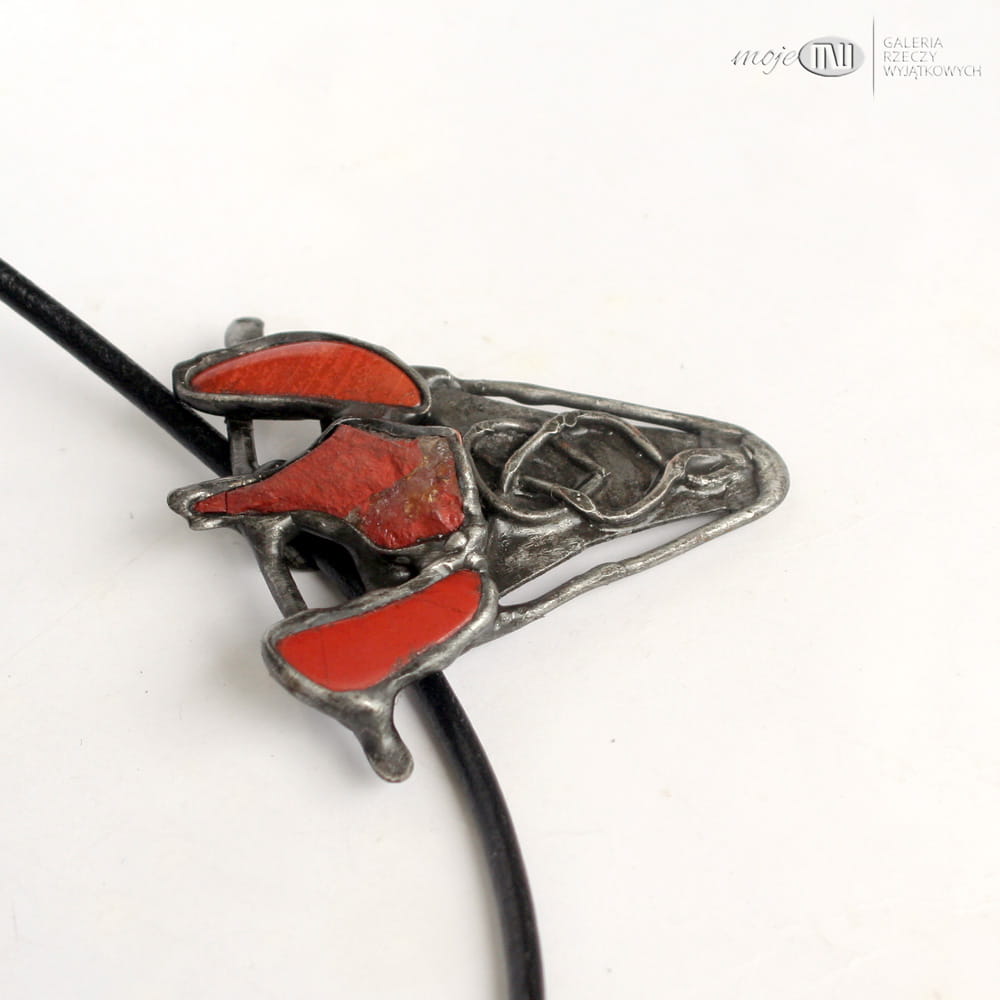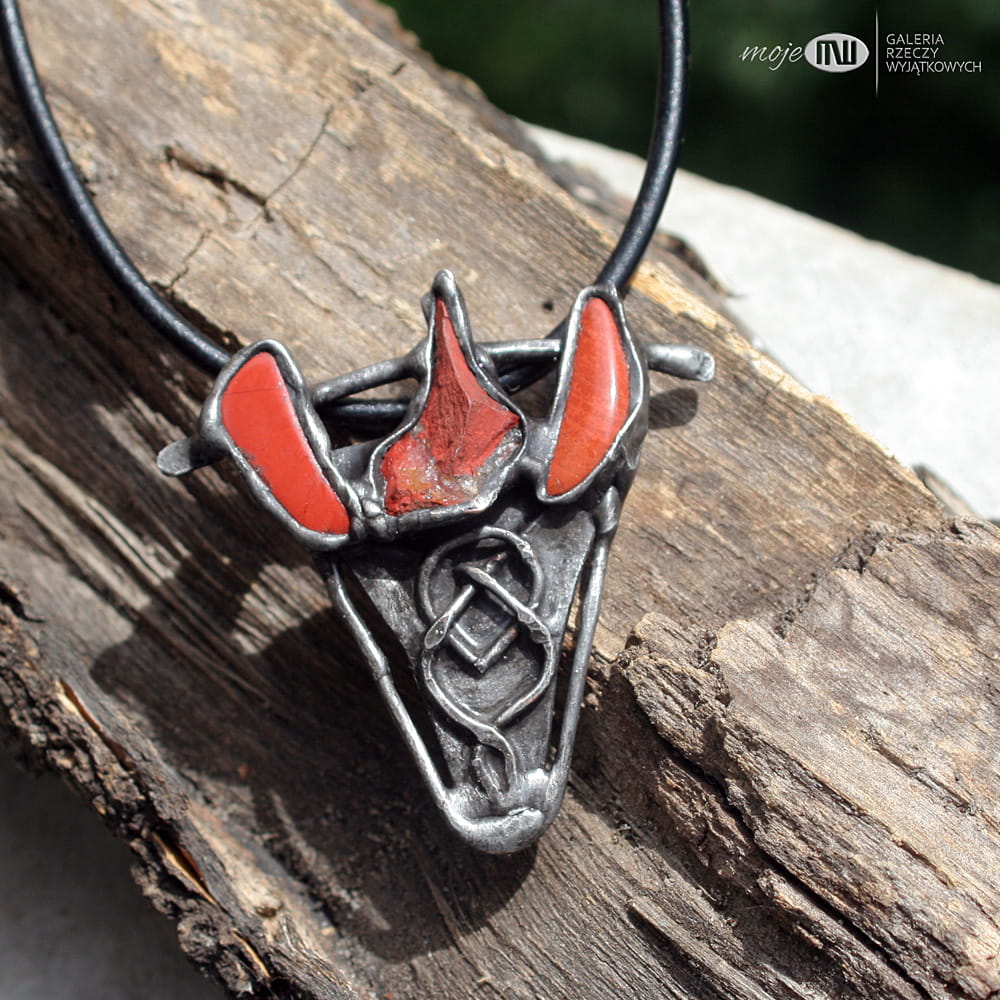 Męski naszyjnik, bardzo rustykalny, z zawieszką w trójkątnym, choć nieco wygładzonym kształcie. Główną jego ozdobą są czerwone jaspisy - jeden surowy i dwa wygładzone. Całość zrobiona jest z miedzi - pokrytej cyną i patynowanej, potem przetartej dla wydobycia zdobień nawiązujących do celtyckiej plecionki. Wisior zawieszony jest na czarnym skórzanym rzemieniu o gr. 3 mm i długości ok 50 cm