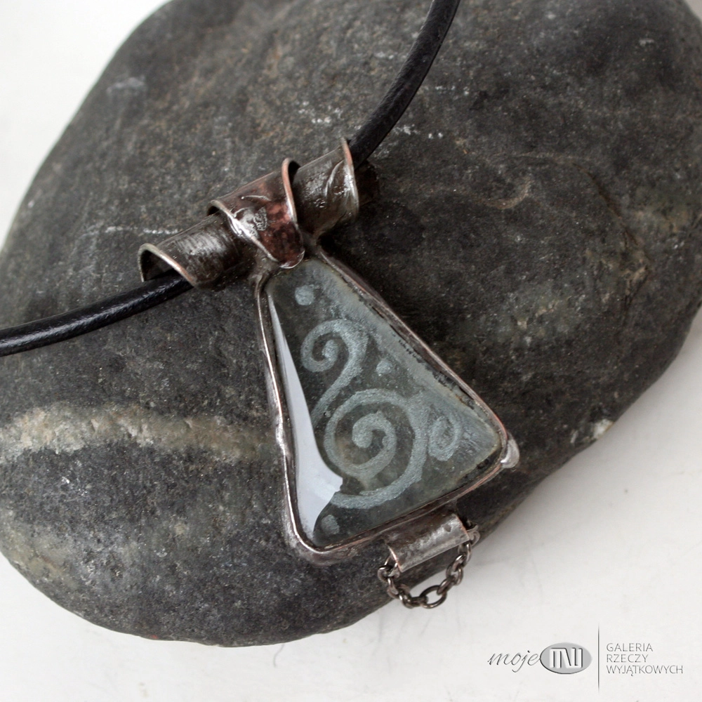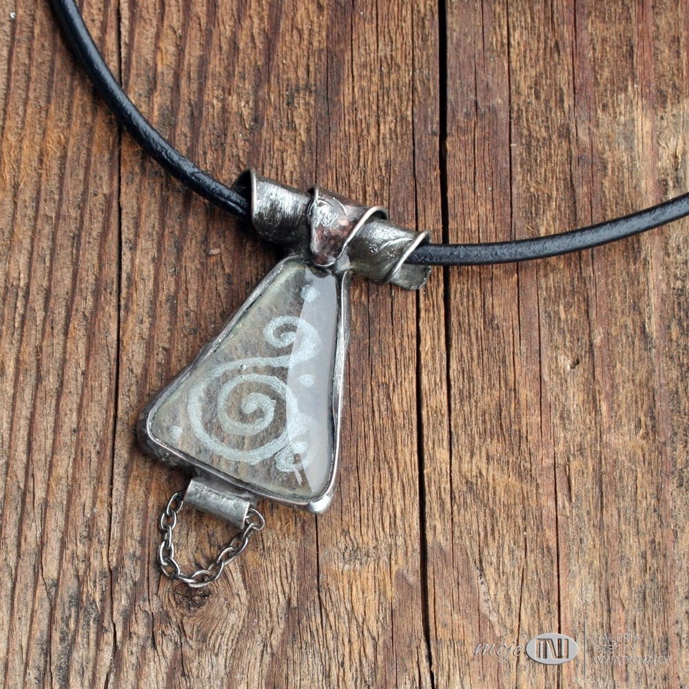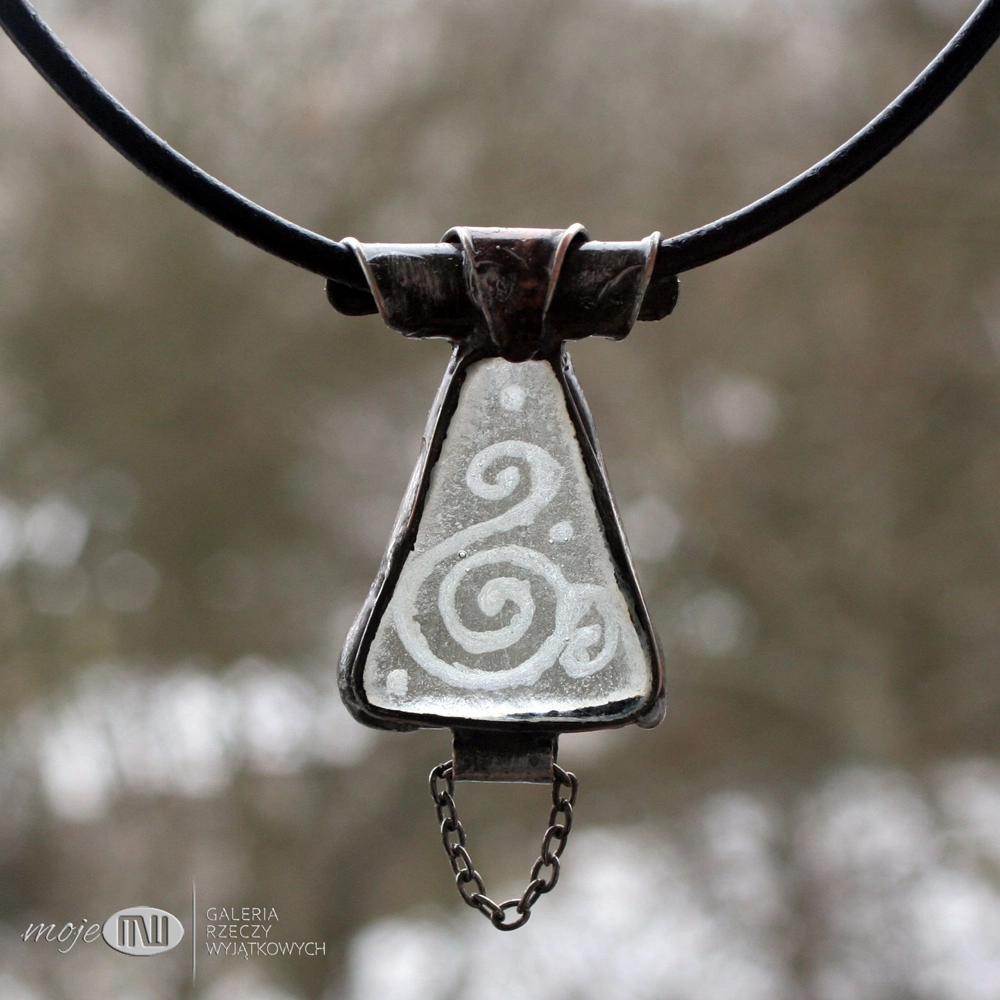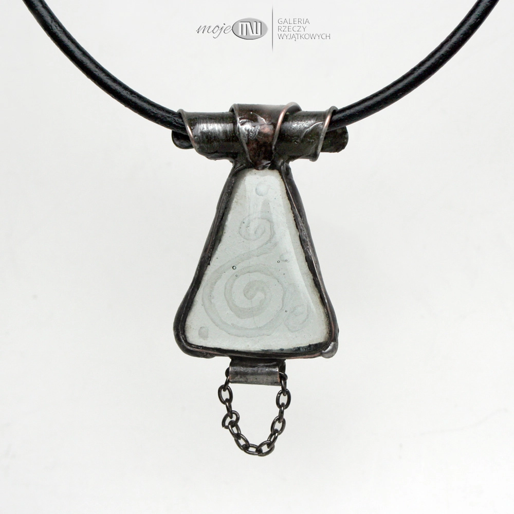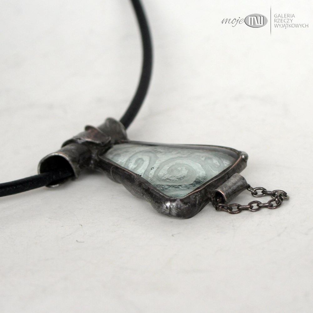 Wisior ze szkła i miedzi pokrytej cyną. Topione bezbarwne szkło,które wygląda jak zamrożone, a w nim ukryty zawijas, który nie zawsze widać. Na jasnym tle prawie znika, natomiast na ciemniejszym widać go wyraźnie.