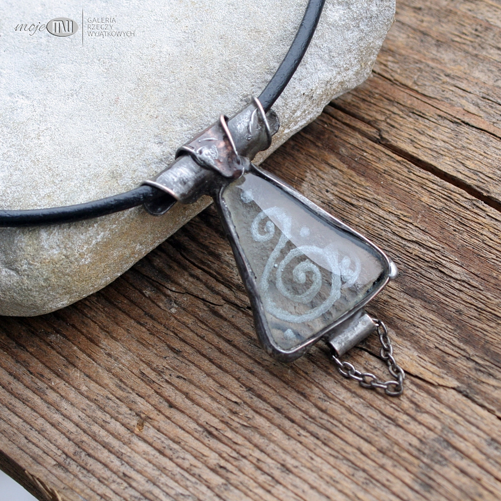 Wisior zawieszony jest na czarnym skórzanym rzemieniu o grubości 3 mm