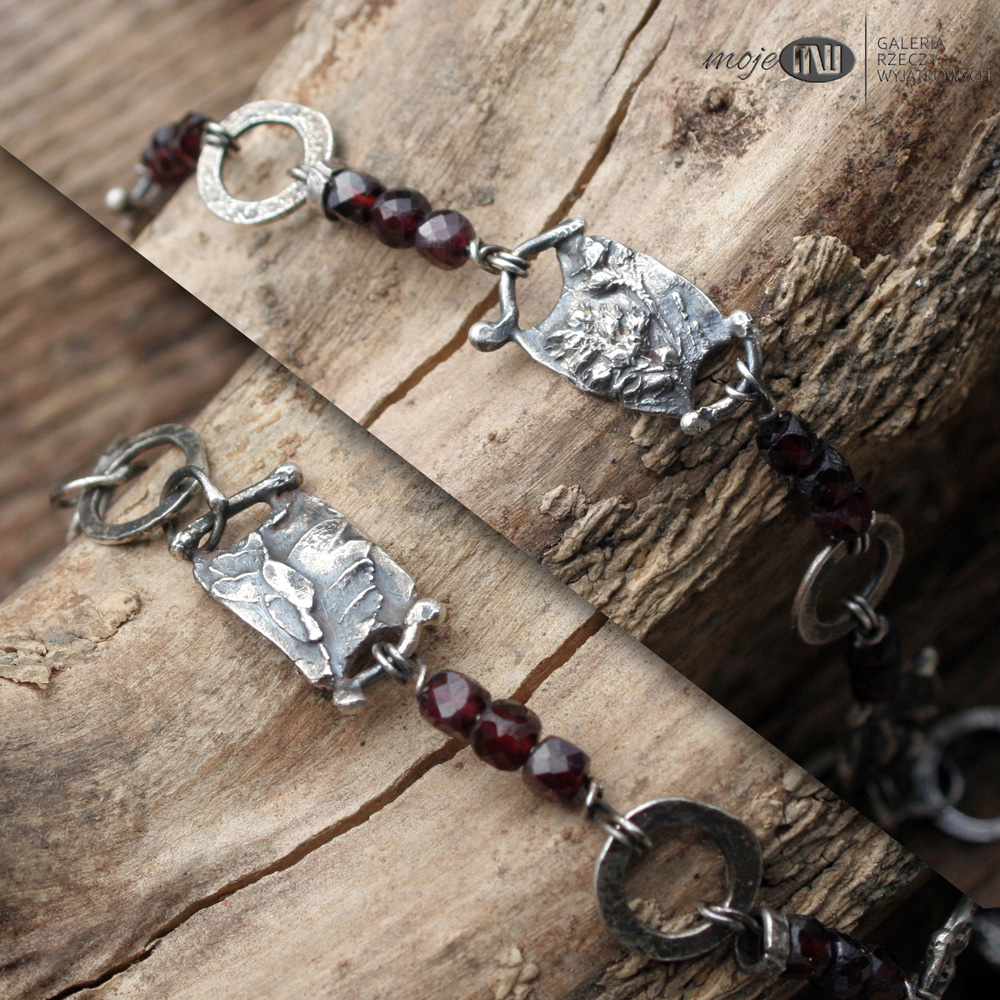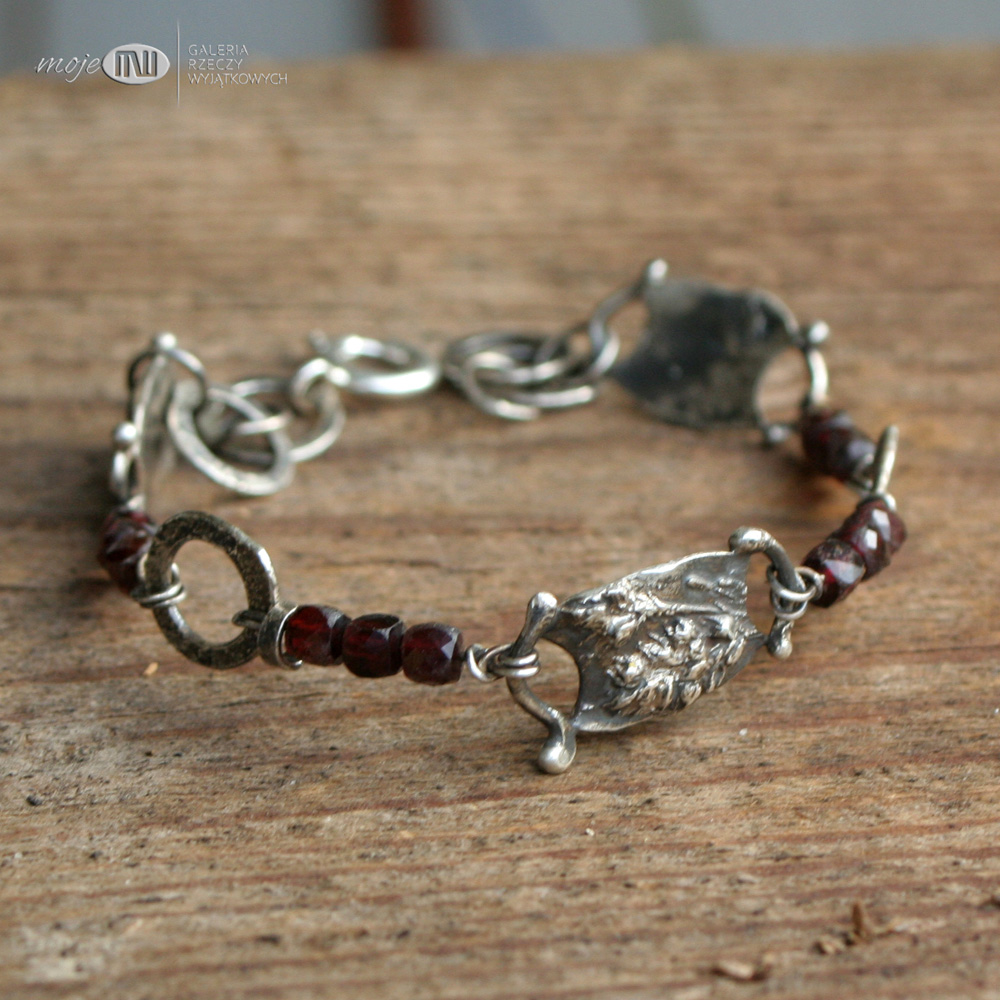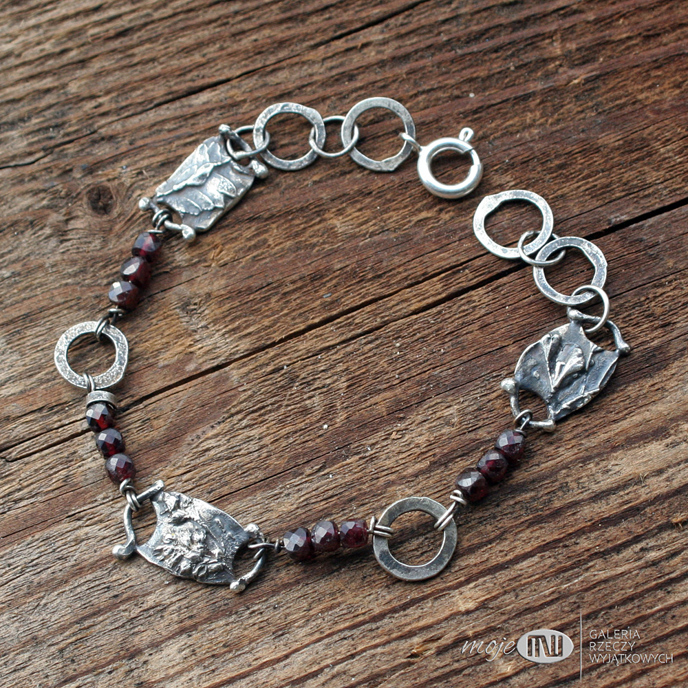 Bransoletka ze srebra i granatów. Elementy ozdobne zrobione są ręcznie ze srebra - to realistyczne wizerunki polnych roślinek. Srebro wysokiej próby jest oksydowane i przecierane dla wydobycia rysunku. Przedzielają go fasetowane granaty.