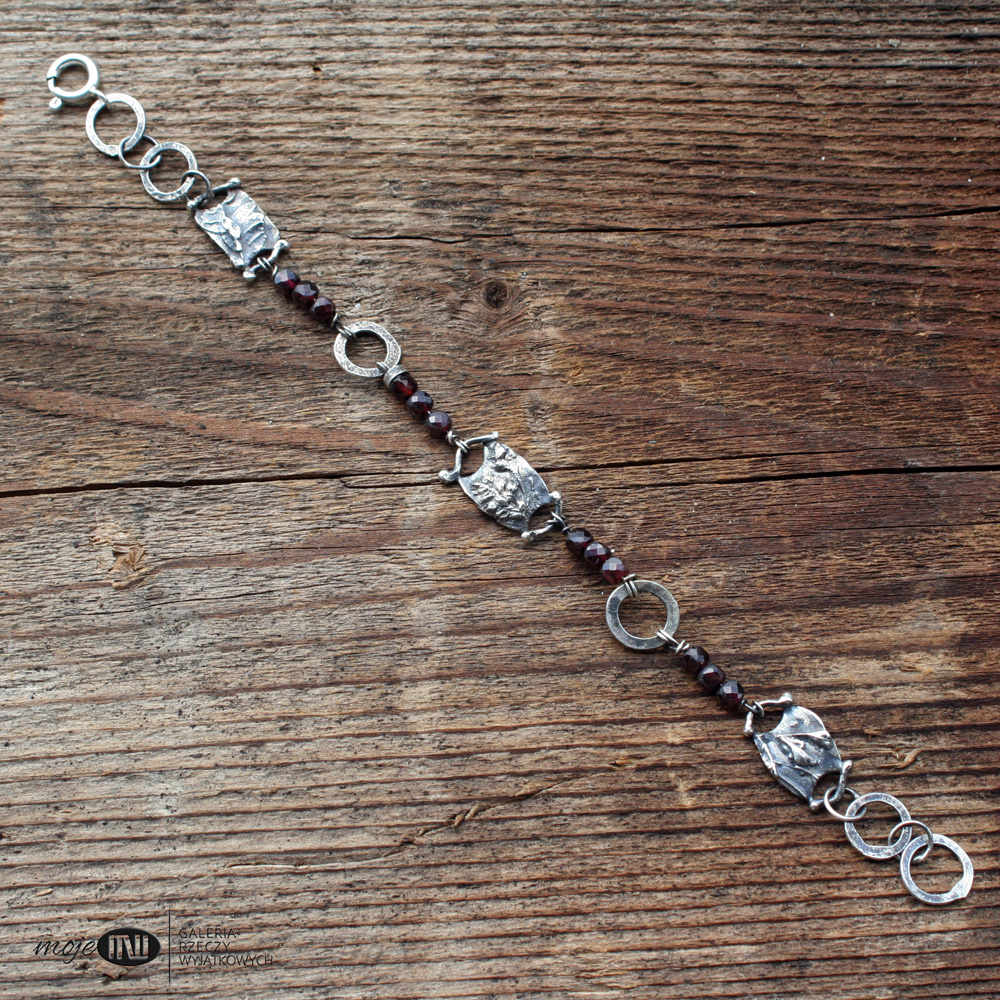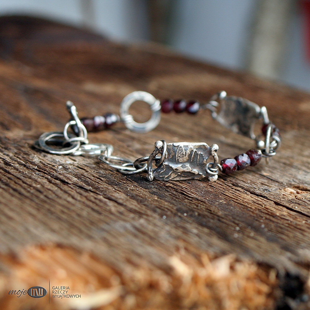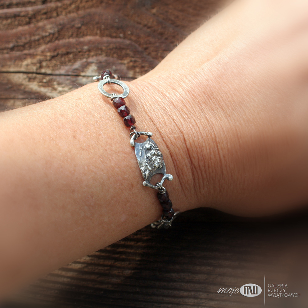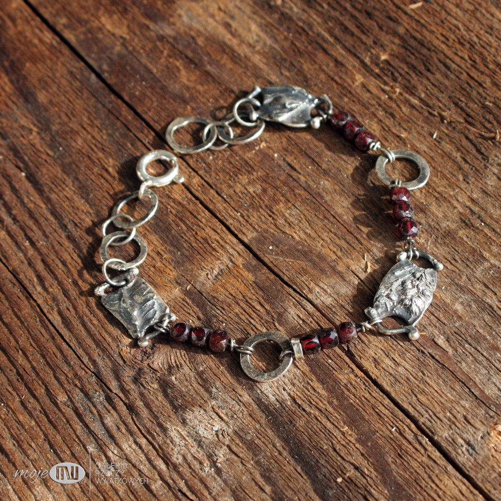 Bransoletka ze srebra i granatów. Elementy ozdobne zrobione są ręcznie ze srebra - to realistyczne wizerunki polnych roślinek. Srebro wysokiej próby jest oksydowane i przecierane dla wydobycia rysunku. Przedzielają go fasetowane granaty.