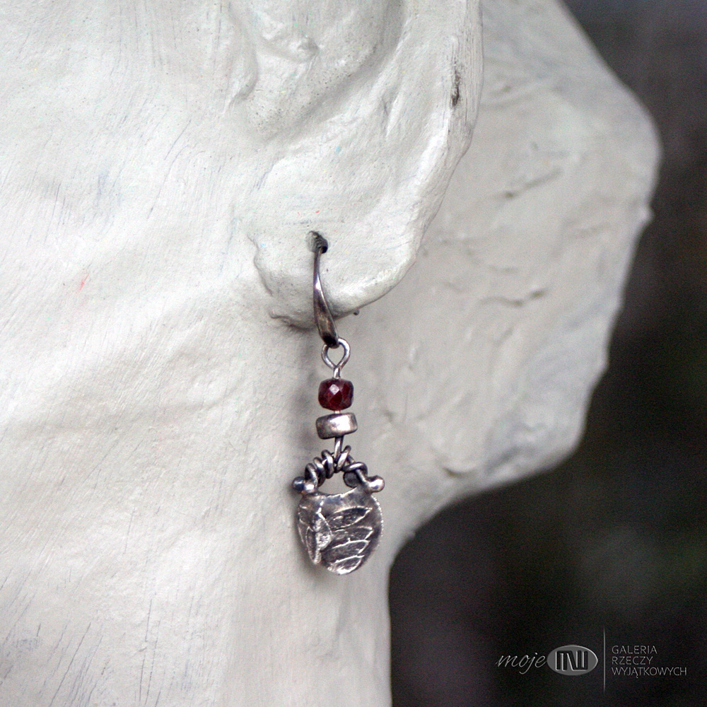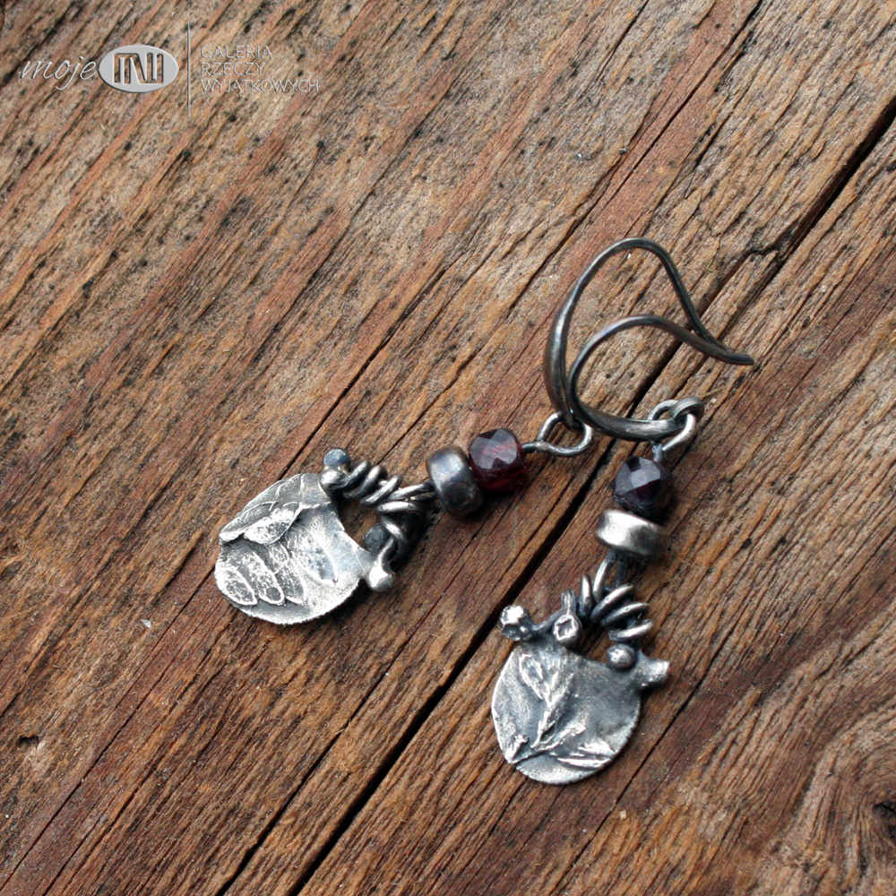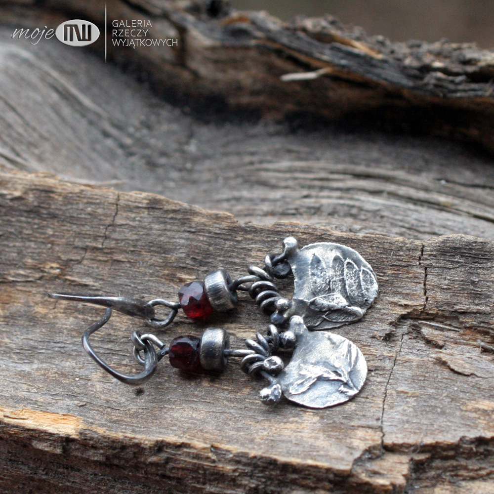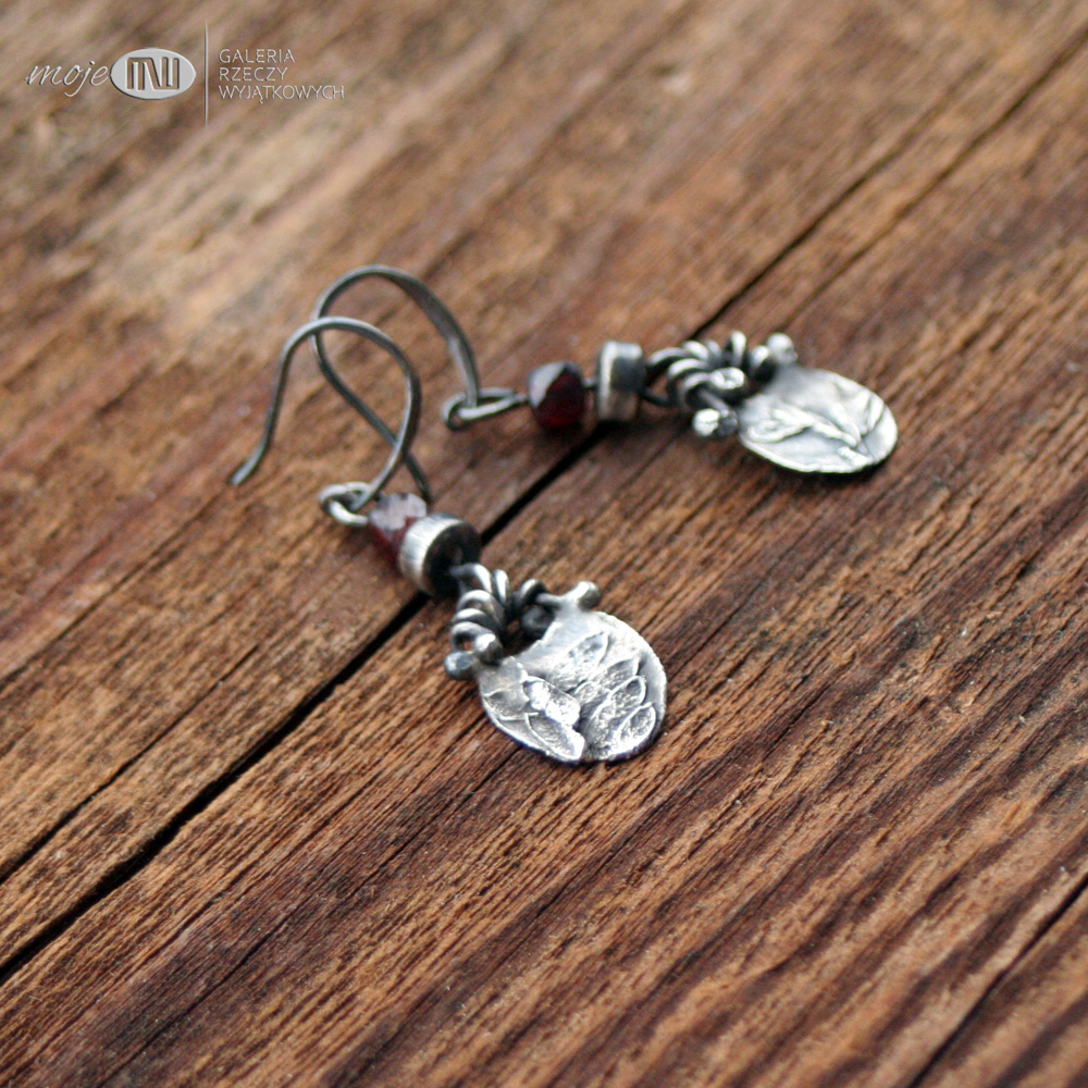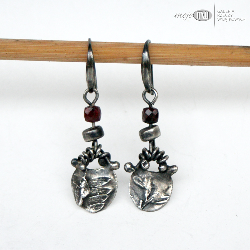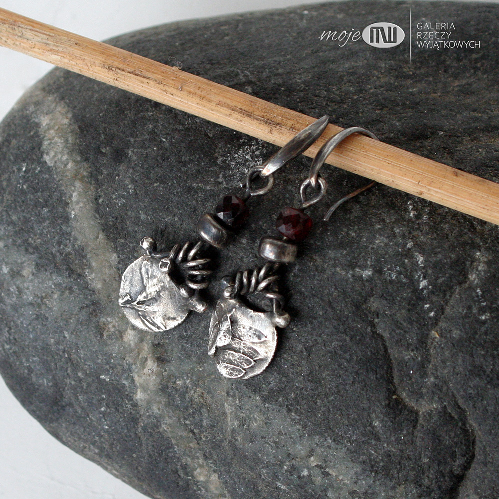 Wiszące niewielkie kolczyki ze srebra z oponką granatu. Ręcznie robiony element ze srebra wysokiej próby z wizerunkiem polnej roślinki - oksydowany i częściowo polerowany dla wydobycia wzoru. Kolczyki ozdabiają fasetowane oponki granatu 4 mm. Zawieszone na srebrnych biglach.