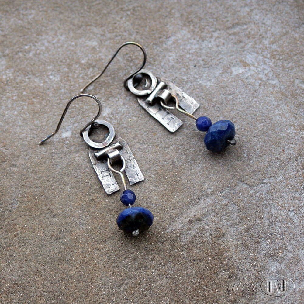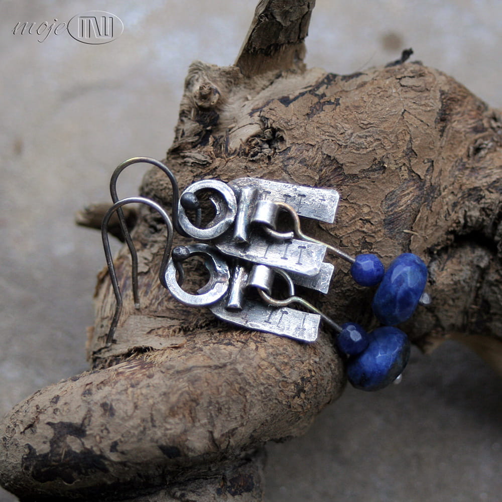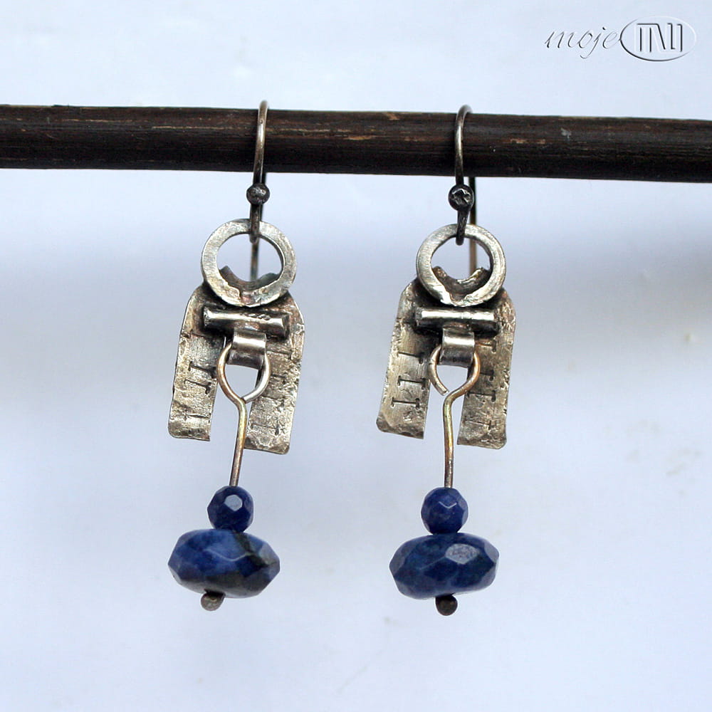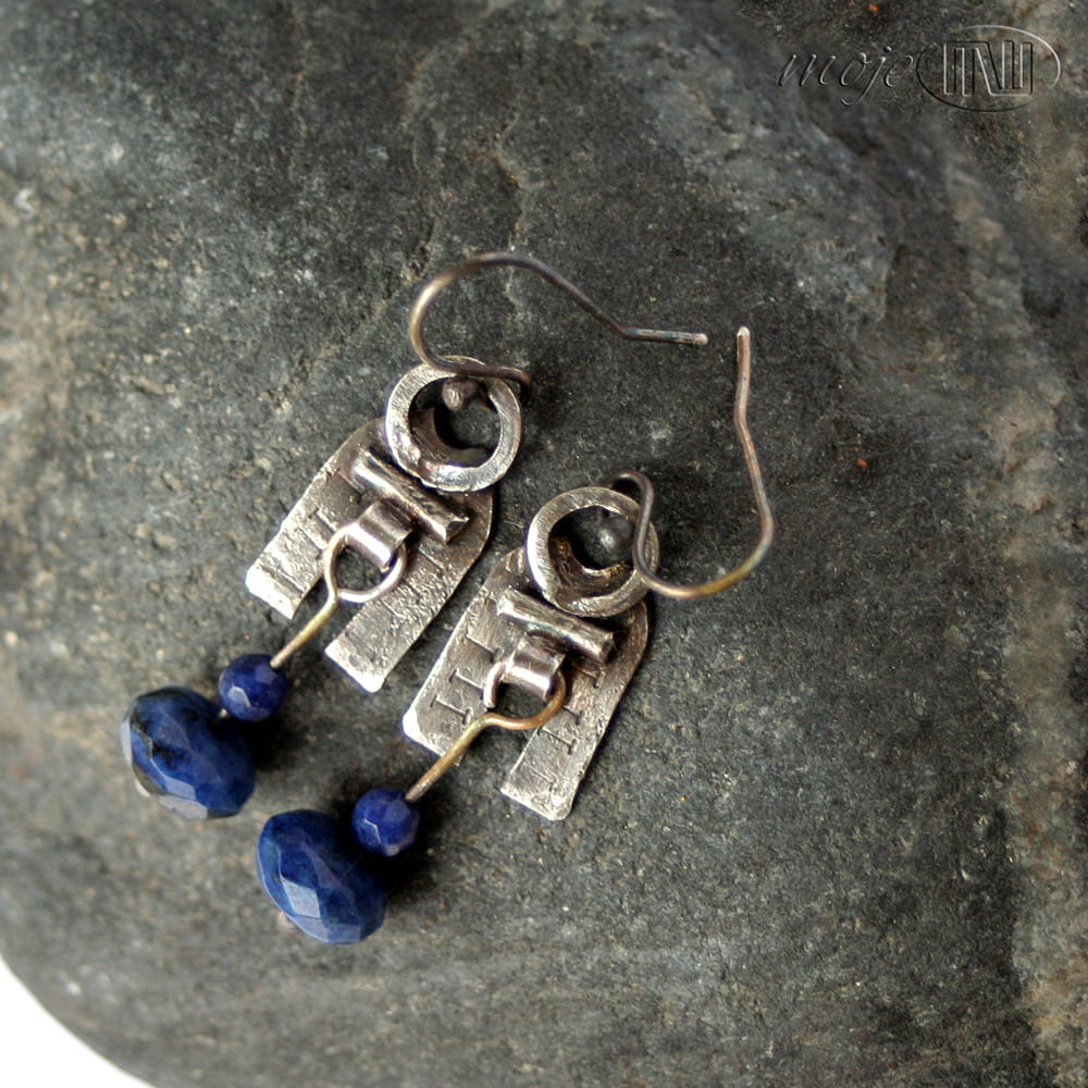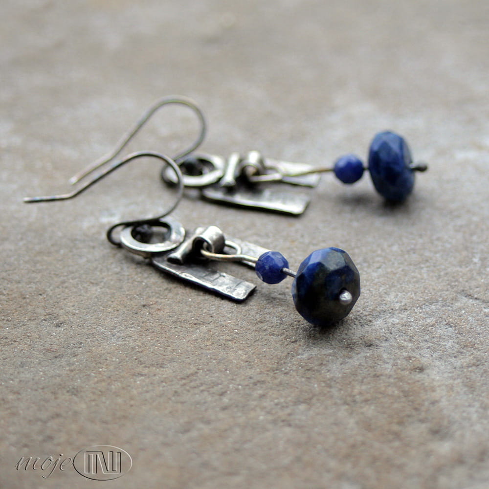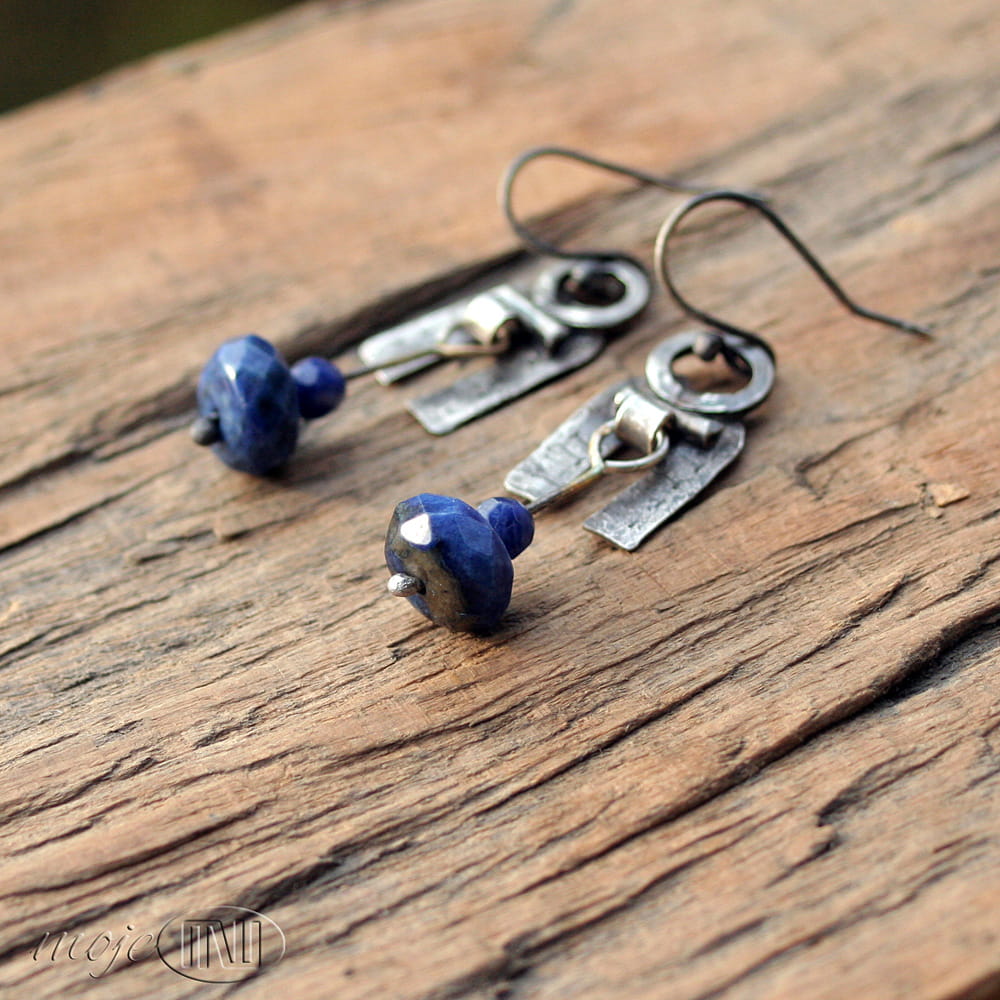 Delikatne kolczyki ze srebra. Ozdabiają je fasetowane sodality - małe kuleczki i oponka. Srebro jest oksydowane i przecierane. Zawieszone na biglach ze srebrnego drutu.