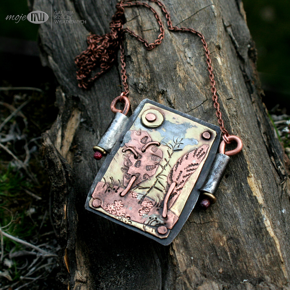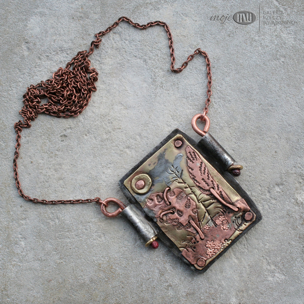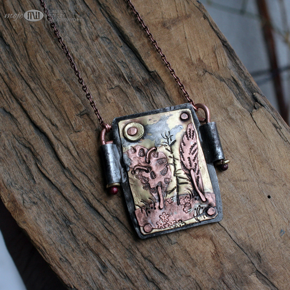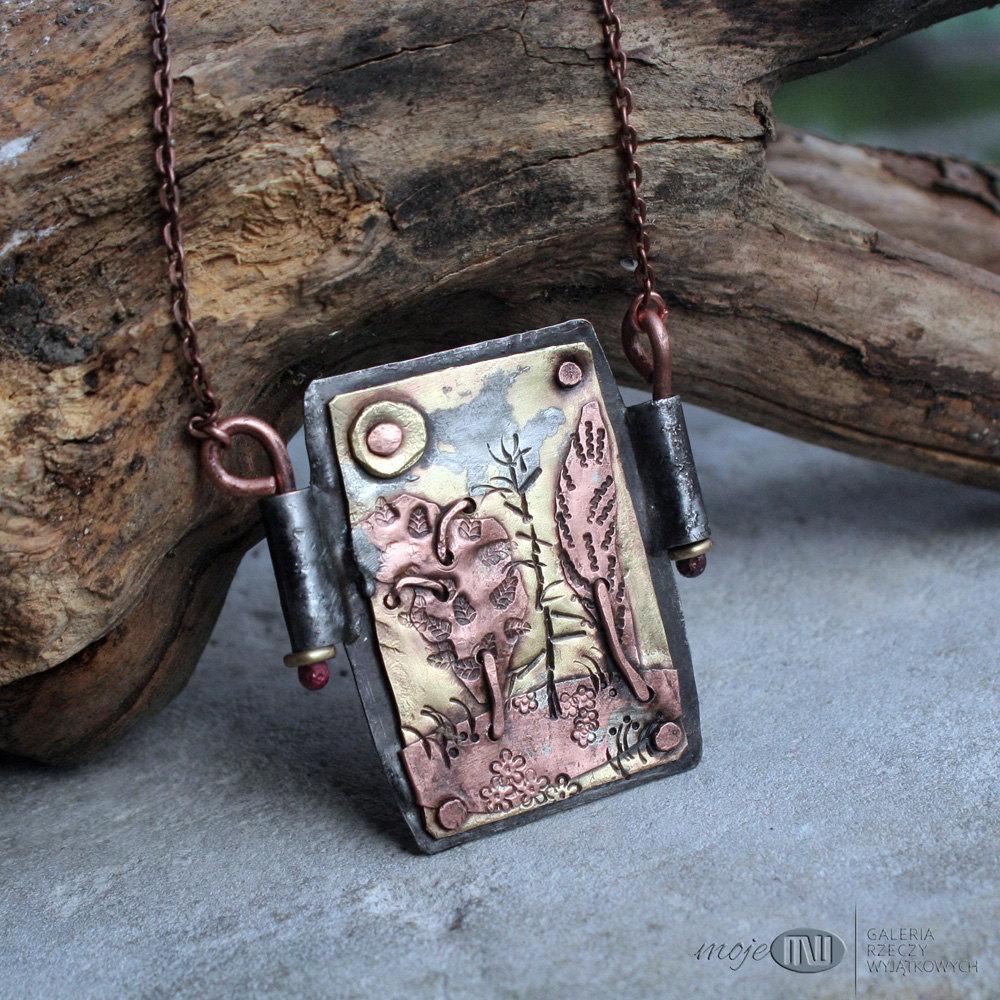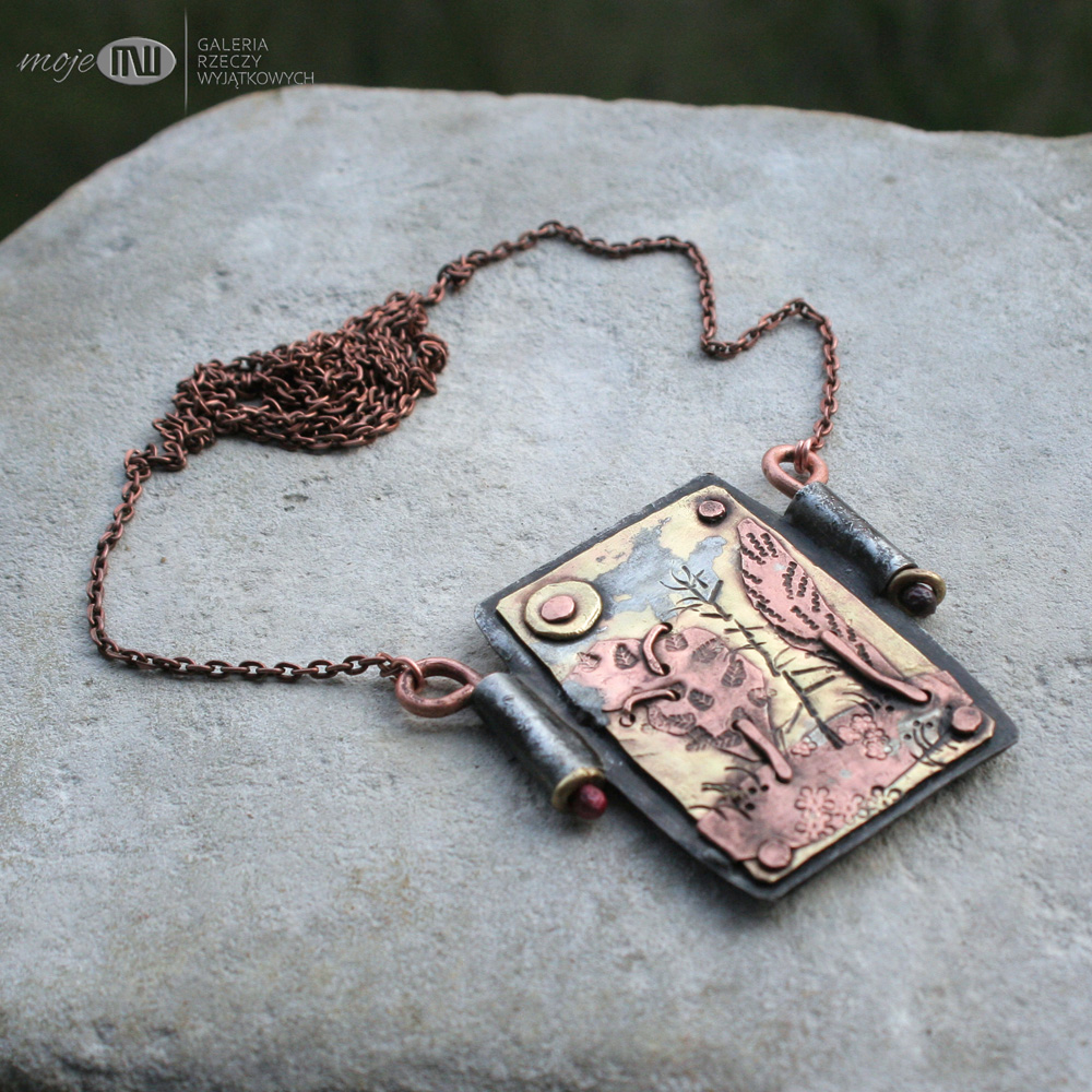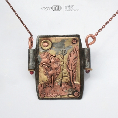 Wisior z miedzi i mosiądzu - prosty widok z drzewami.