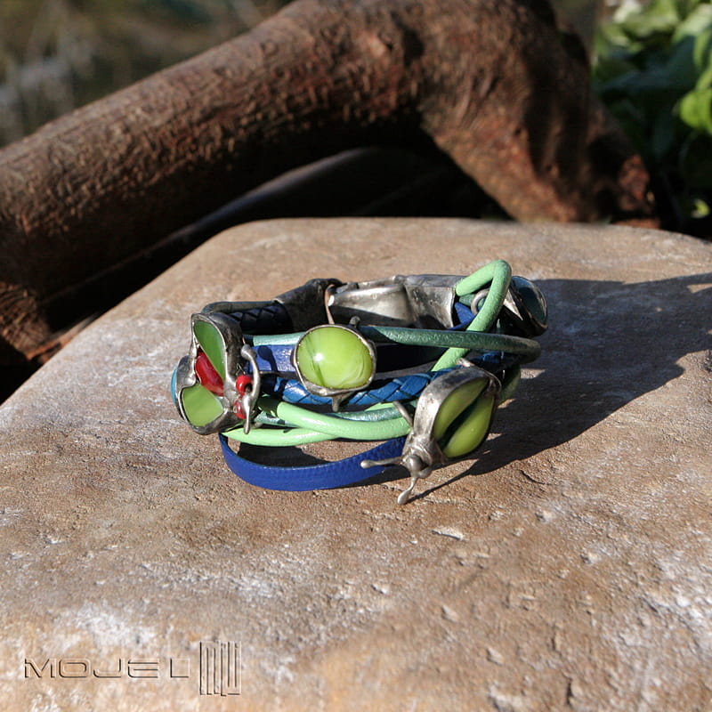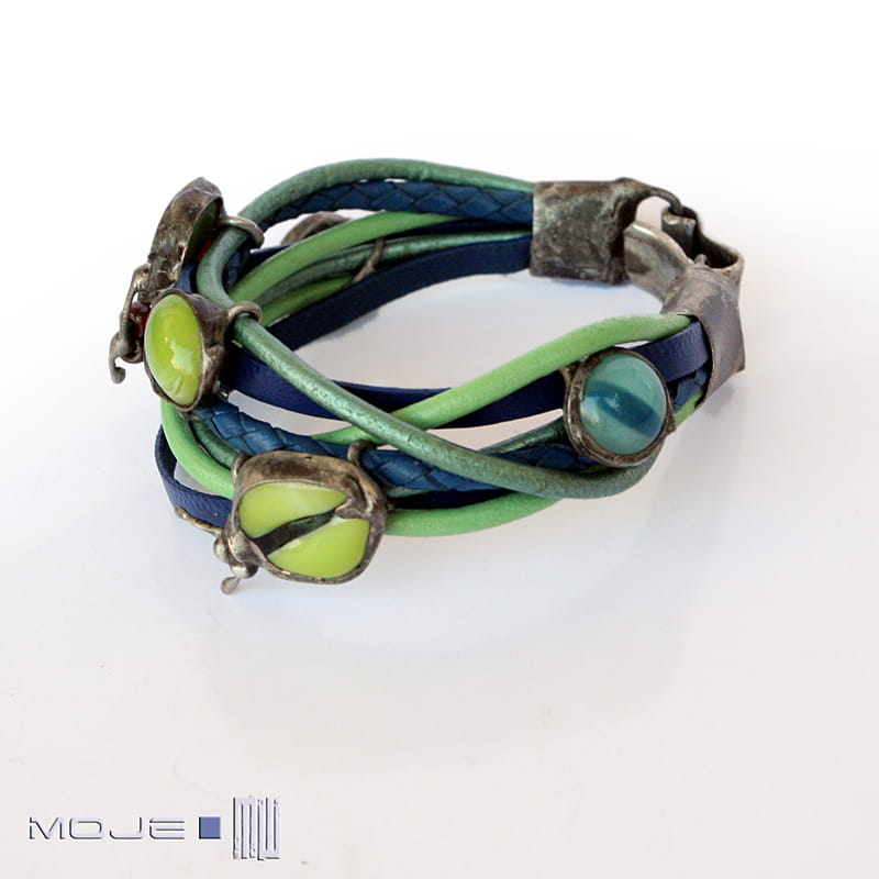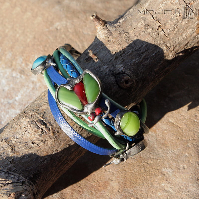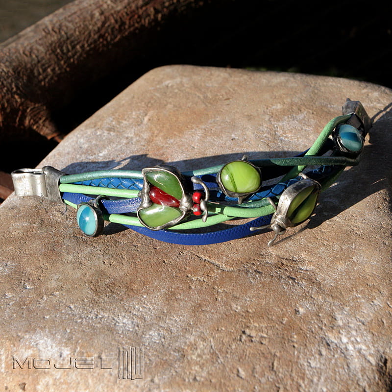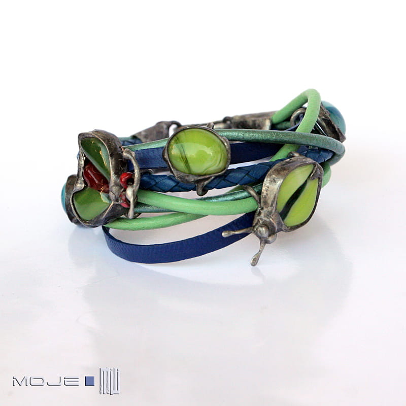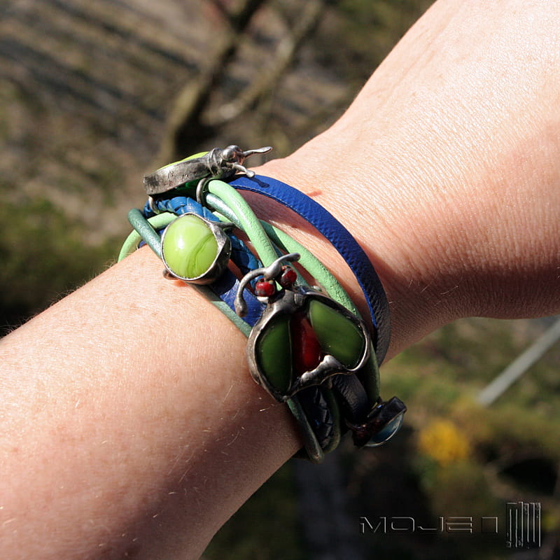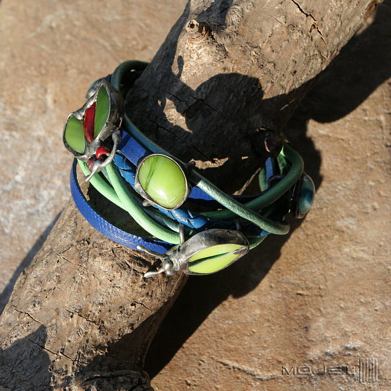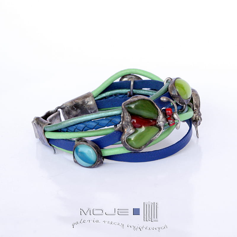 Bransoletka z kolorowych rzemieni - głównie niebieskich oraz w odcieniach zieleni. Rzemienie są okrągłe o gr. 4 i 3 mm, jeden pleciony ok 5 mm oraz płaskie o szer. 0,5 cm. Jednak głównymi elementami ozdobnymi są szklane owady i kaboszon, które wytopiłam metodą fusingu głównie z zielonego szkła. Szklane dodatki oprawione są w miedź - cynowaną, patynowaną i przecieraną. Zapięcie również zrobione jest z miedzi.