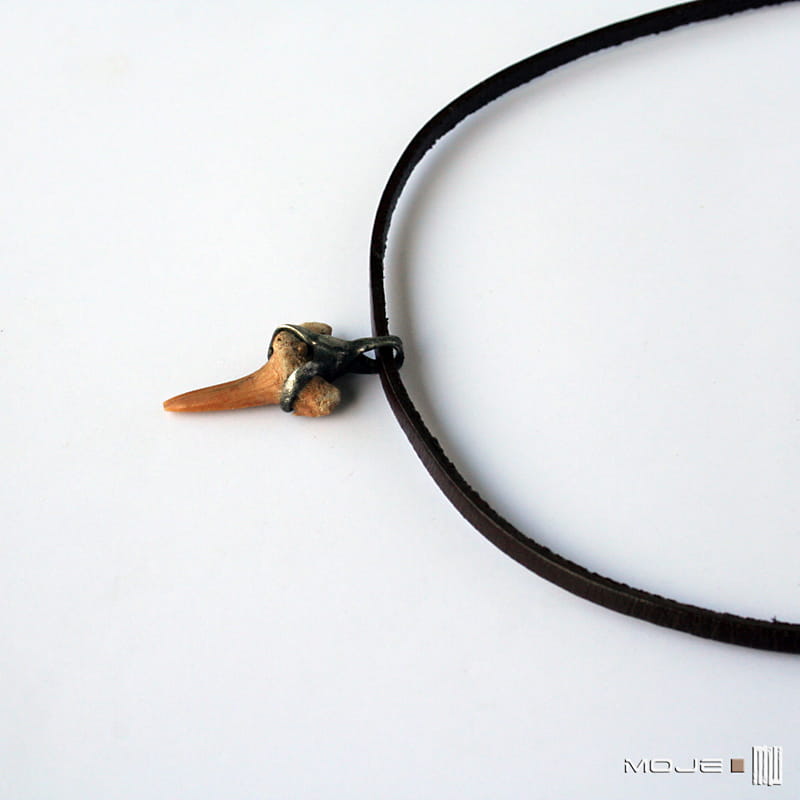 Oprawiony jest w sposób minimalistyczny - w miedź cynowaną, patynowaną i przecieraną, a zawiesiłam go na skórzanym brązowym, płaskim rzemieniu o dł. ok. 50 cm i szer. 3 mm. Wysokość zęba - ok. 26 mm