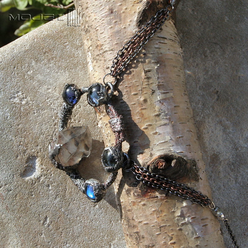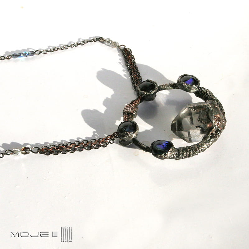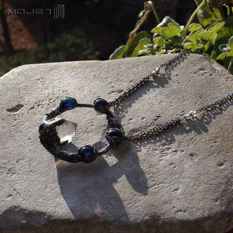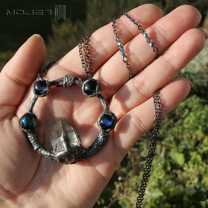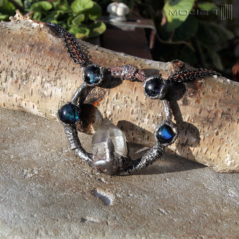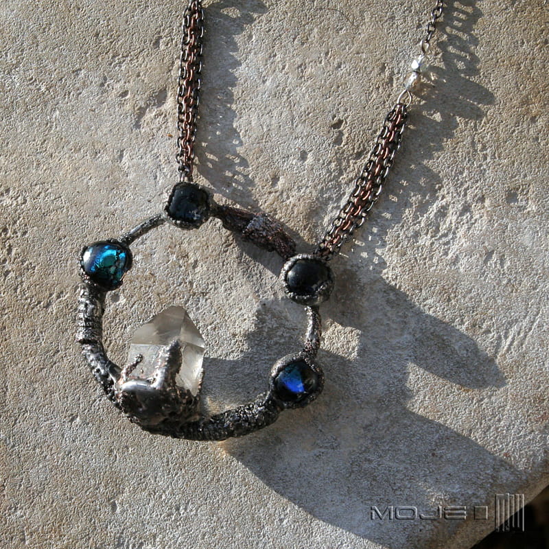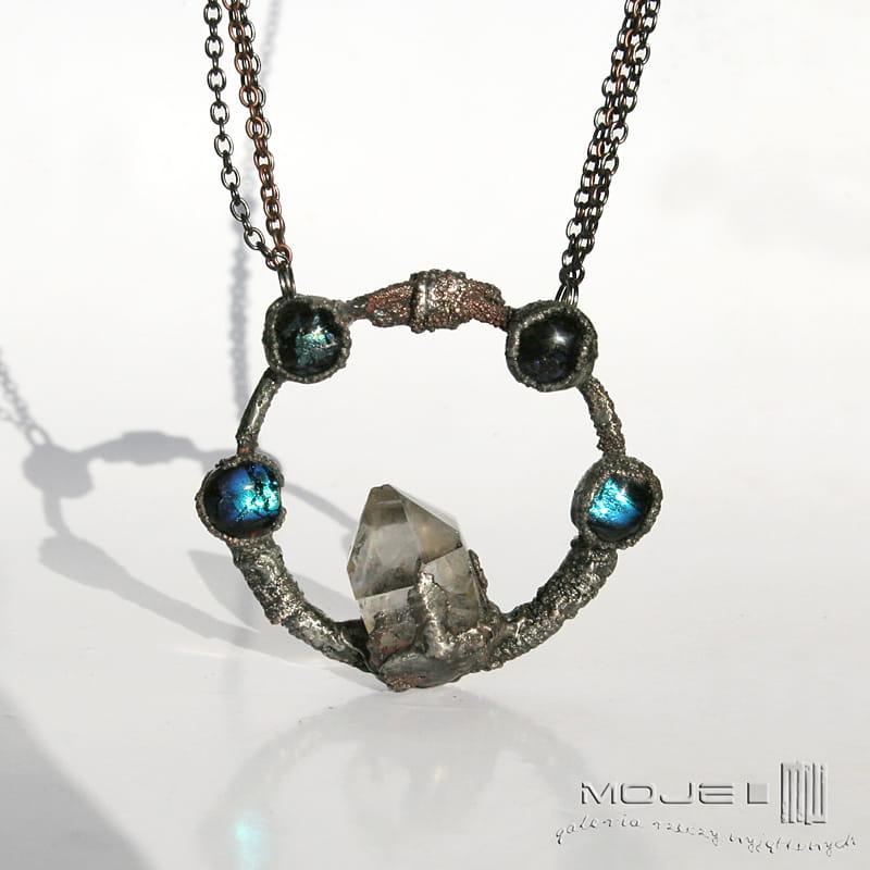 Kolisty wisior z kryształem górskim i szklanymi kaboszonami. Struktura jego powierzchni powstała w technice elektroformowania. Wisior jest też częściowo cynowany, całość patynowana i przecierana dla wydobycia faktury. Sposób wykonania sprawia, że nie jest idealnie gładki. Kaboszony są ze szkła dichroicznego, lekko opalizującego w słońcu.