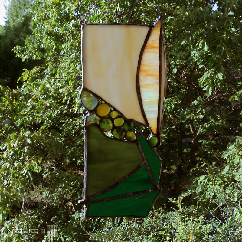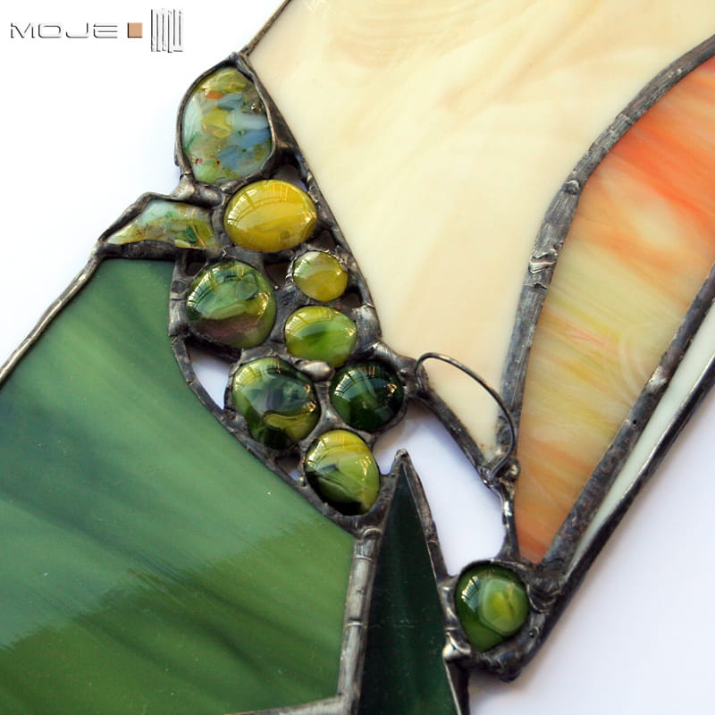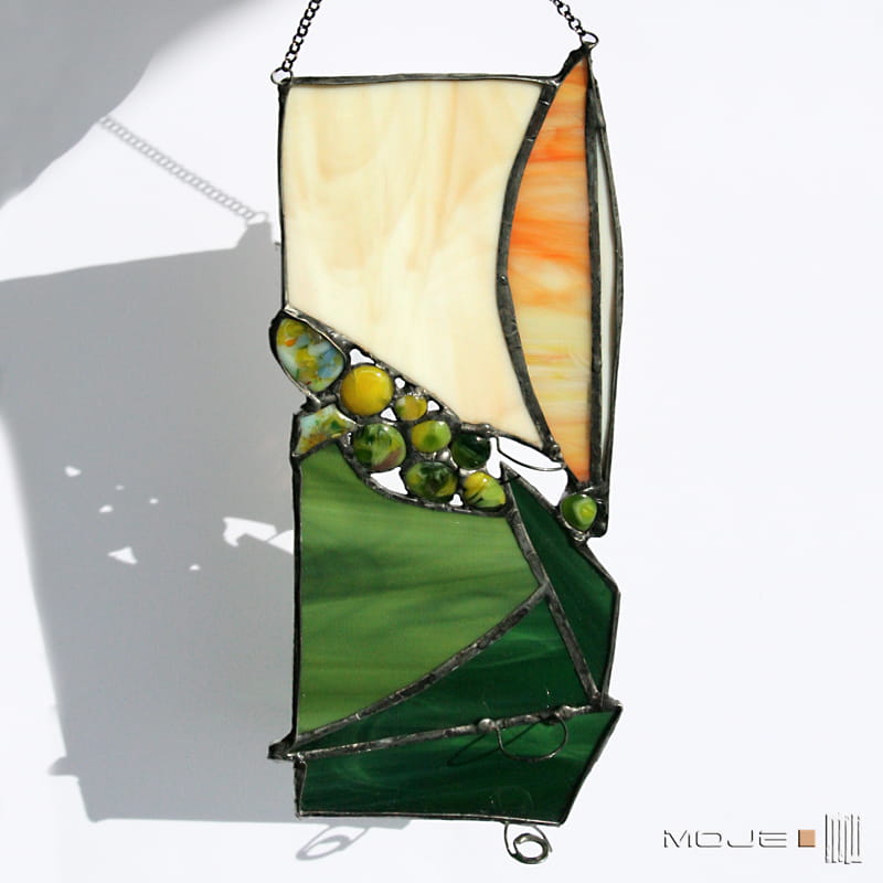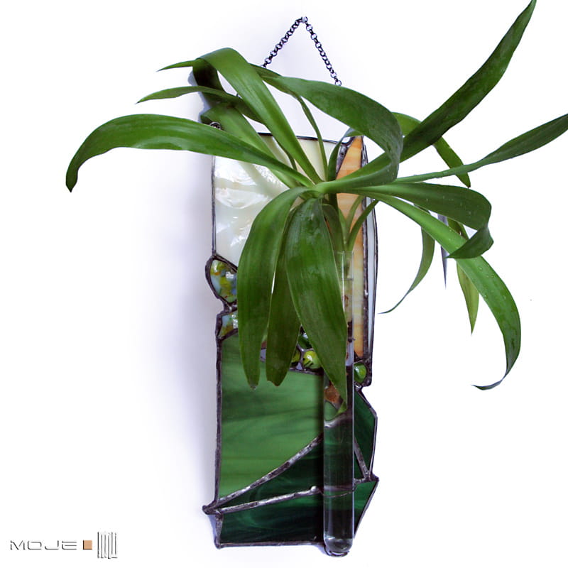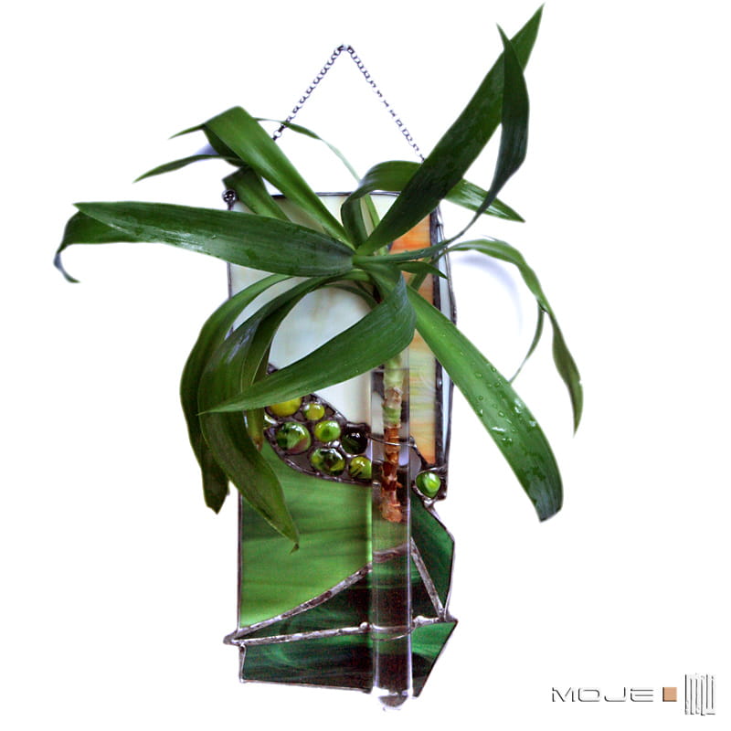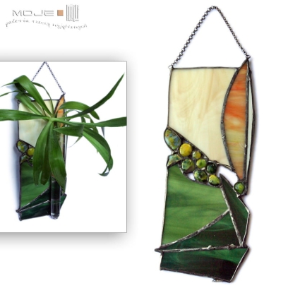 Witrażowy wiszący dekor, który może być pięknym wspomnieniem z wakacji a także... wazonikiem. Zrobiłam go z witrażowego szkła w odcieniach zieleni, ecru i żółto-pomarańczowym. Dodatkowym elementem ozdobnym są wytopione przeze mnie metodą fusingu szklane kaboszony. Całość oprawiona i wykończona jest miedzią - cynowaną, patynowaną i przecieraną. Wiszący dekor ma uchwyty, w które należy wsunąć podłużny szklany "wazonik" z pojedynczym żywym kwiatem, zieloną laską bambusa, lub suszonym kwiatem. Pięknie wygląda na ścianie lub w oknie i stanowi niebanalny element dekoracyjny.