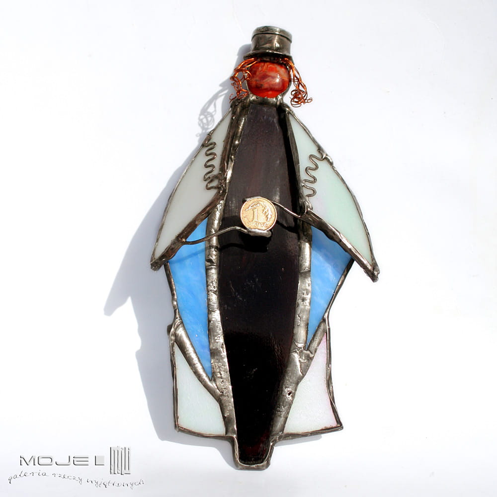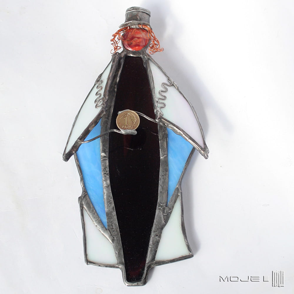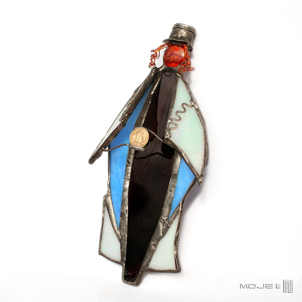 Żydek na szczęście - figurka zrobiona jest ze szkła witrażowego metodą Tiffany'ego. W ręce trzyma grosik na szczęście.