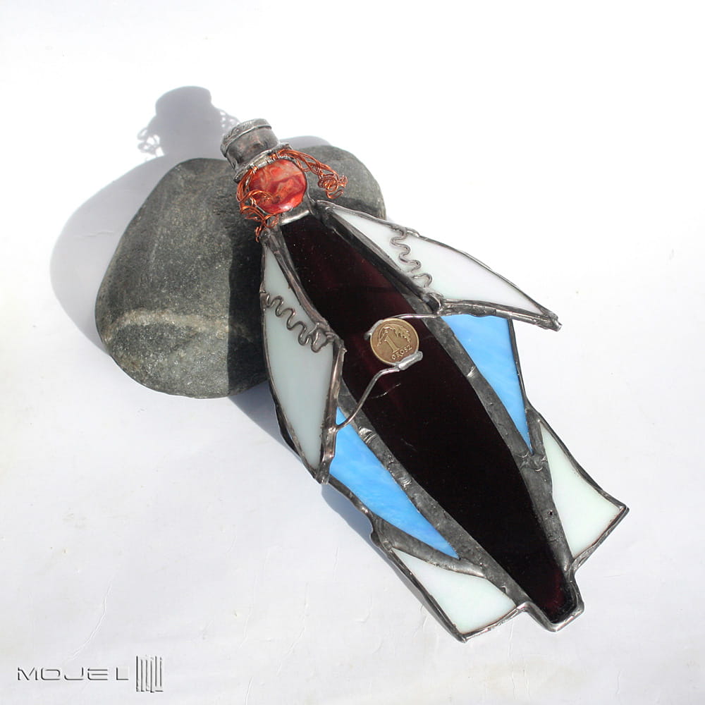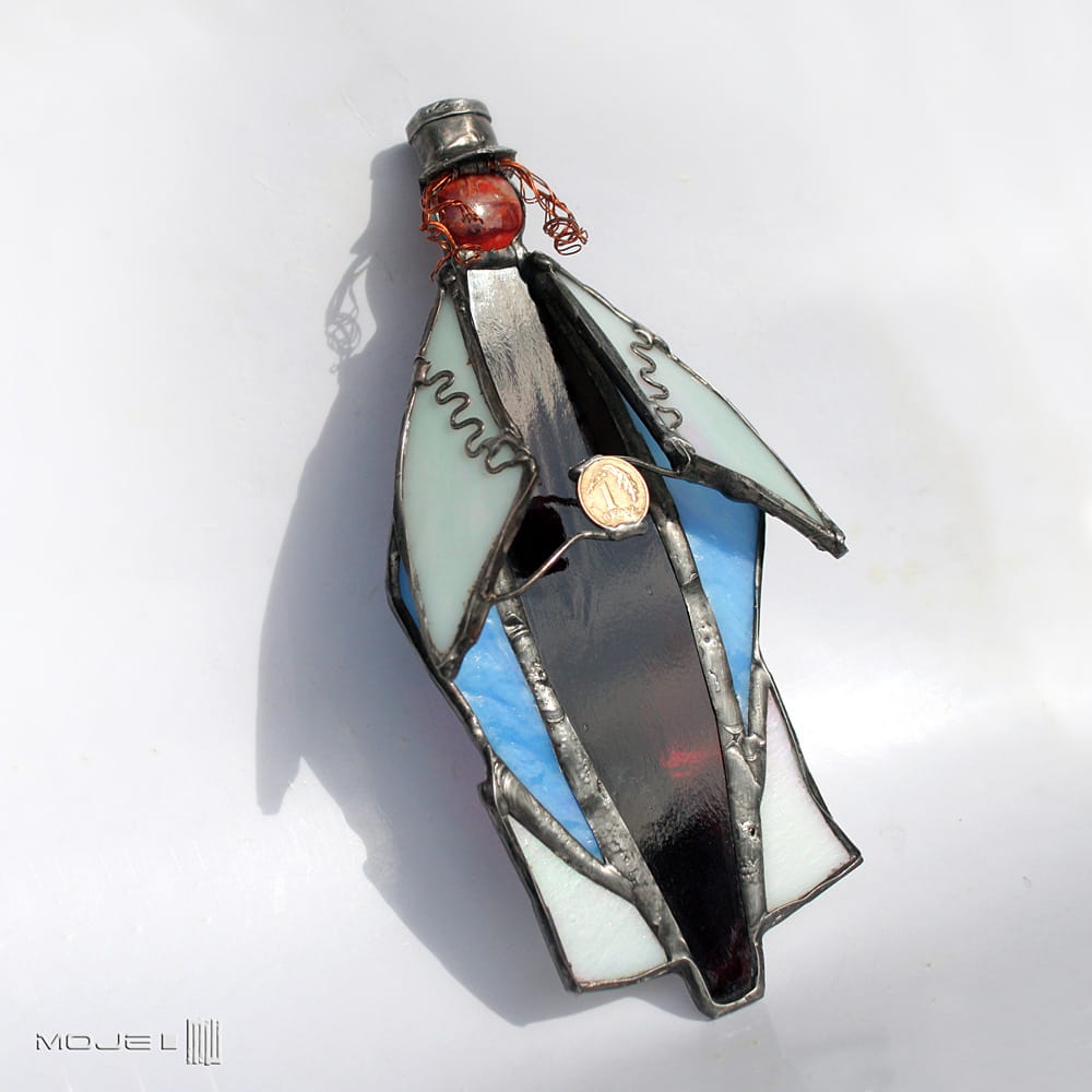 Dekor wiszący. Kolory szkła: szkło bardzo ciemne fioletowe, niebieskie, szkło białe z opalizującą powłoką. Wykończony miedzią cynowaną i patynowaną.